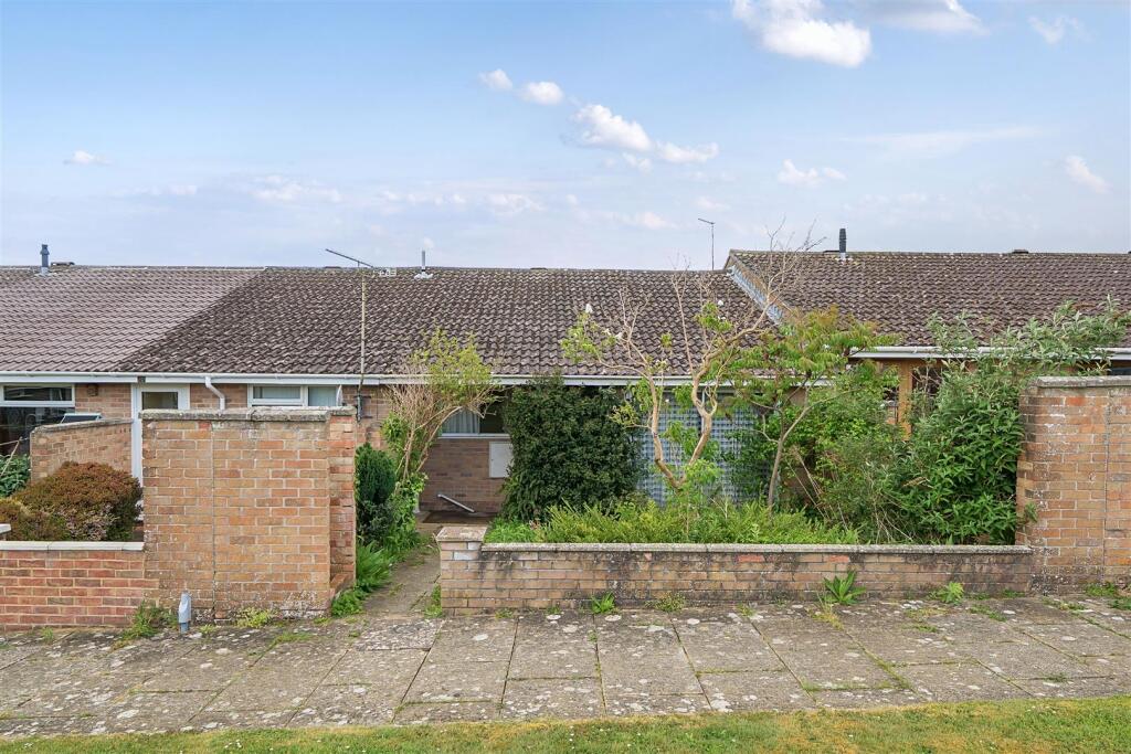 Spacious two-bedroom bungalow requiring full modernisation, with front and rear gardens and a single garage located in a nearby block.