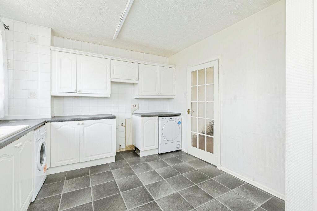 This is a three-bedroom flat in Motherwell North, presented by Purplebricks. The property requires renovation, as evidenced by the interior photos. The kitchen and bathroom are functional but dated, and the bedrooms need refurbishment. The property benefits from a garden with sheds. The location offers reasonable access to transportation, with Carfin train station approximately 2km away. The list price of £72,500 is notably lower than the average in the area, reflecting the condition of the property and offering potential for value enhancement through renovation.