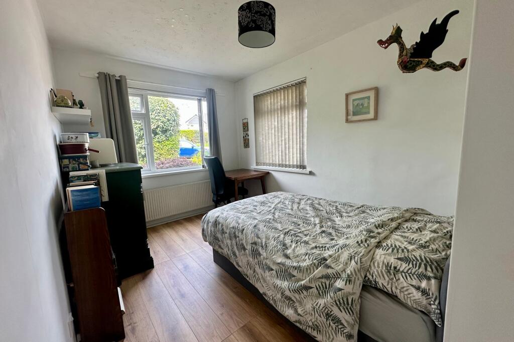 Spacious and individual four bedroom bungalow in delightful cu de sac, edge of town location with gloriously established and private 90' deep x 30' wide rear garden abutting the wooded nature reserve.