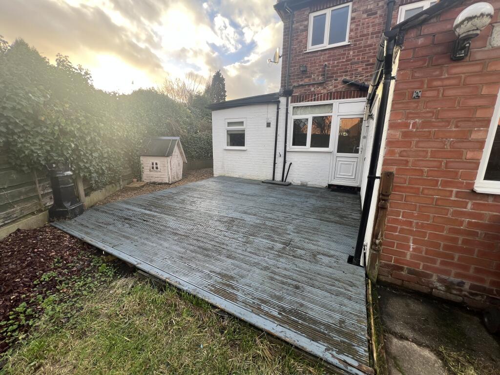 This is a three-bedroom semi-detached property in Reddish North, Stockport. It benefits from a modern kitchen and bathroom, a conservatory, and a good-sized garden. The property also has a garage. The location is convenient for families, with nearby schools and transportation links. While the decking area may need some maintenance, the property is generally in good condition and offers good value for money based on the price per square foot compared to the local average. The property appears to be a traditional build that has been modernised.