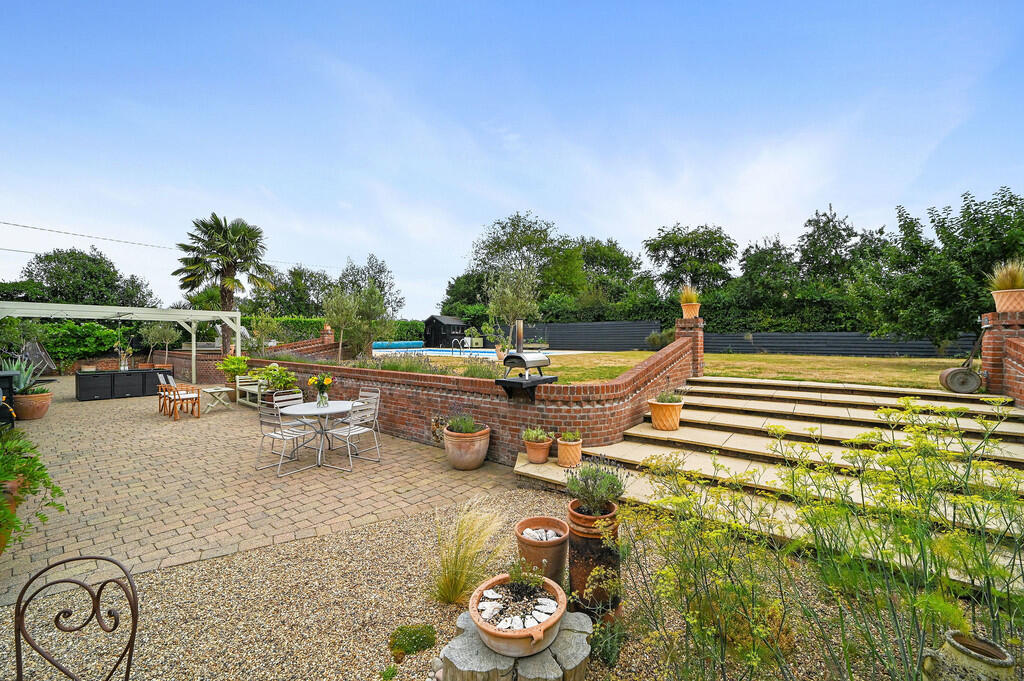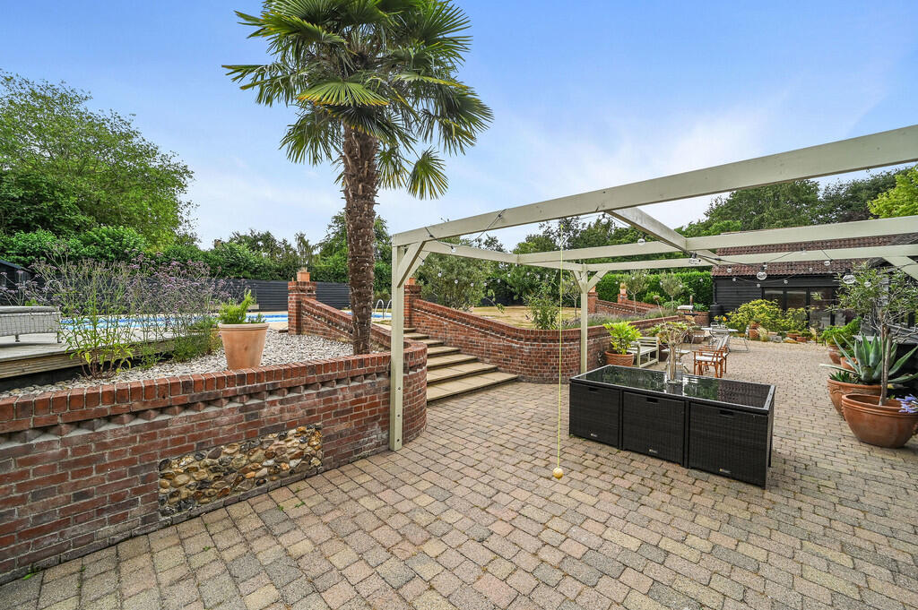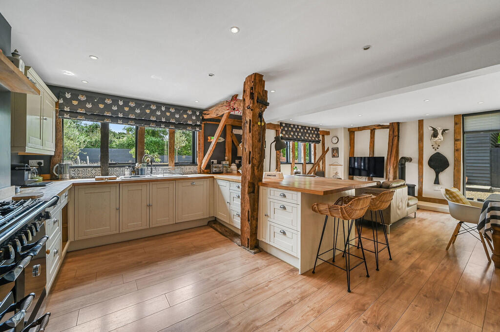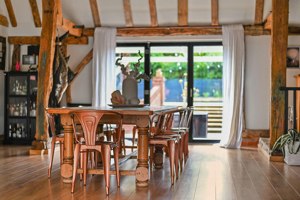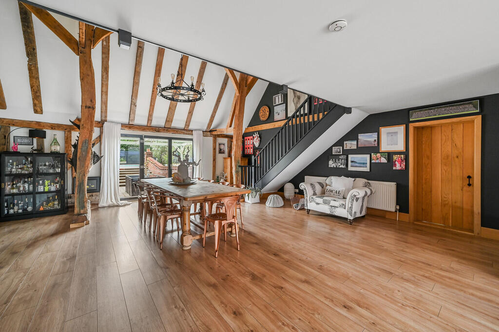 A barn conversion located in Mount Bures, Essex, featuring five bedrooms, four bathrooms, a garden, and a swimming pool. The interior blends traditional features with modern living spaces. Nearby, Bures train station is 2.68 km away, and Bures Church of England Voluntary Controlled Primary School is nearby with an ‘Outstanding’ Ofsted rating.