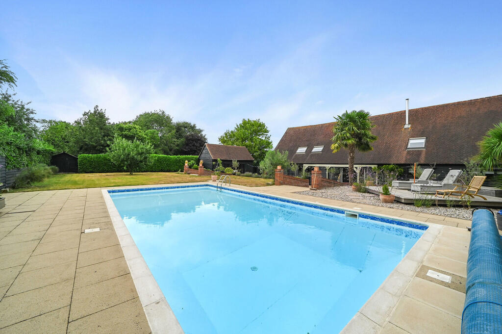 Elms Barn is a beautifully presented Grade II listed barn conversion offering over 4,800 sq ft of flexible living space, including five bedrooms, three en-suites, a vaulted reception hall, three reception rooms and landscaped south-facing gardens with a heated pool and summer house. Set within 0....