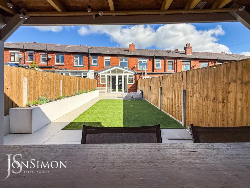 This is a well-presented terraced property in Ramsbottom, Bury. The property has been modernised throughout and features a modern kitchen and bathroom. The property also benefits from a good-sized garden with a patio area and a built-in bar. The property is located close to local schools and amenities, making it an ideal family home. The property is listed for £260,000, which is slightly above the average price for the area, but the condition and features of the property justify the price.