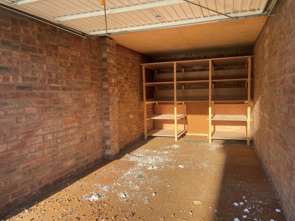 The provided images show a garage in reasonable structural condition externally but internally it appears unkempt and in need of a thorough clean-up. Debris is visible on the floor, suggesting a lack of recent maintenance or upkeep. The interior features simple shelving units.