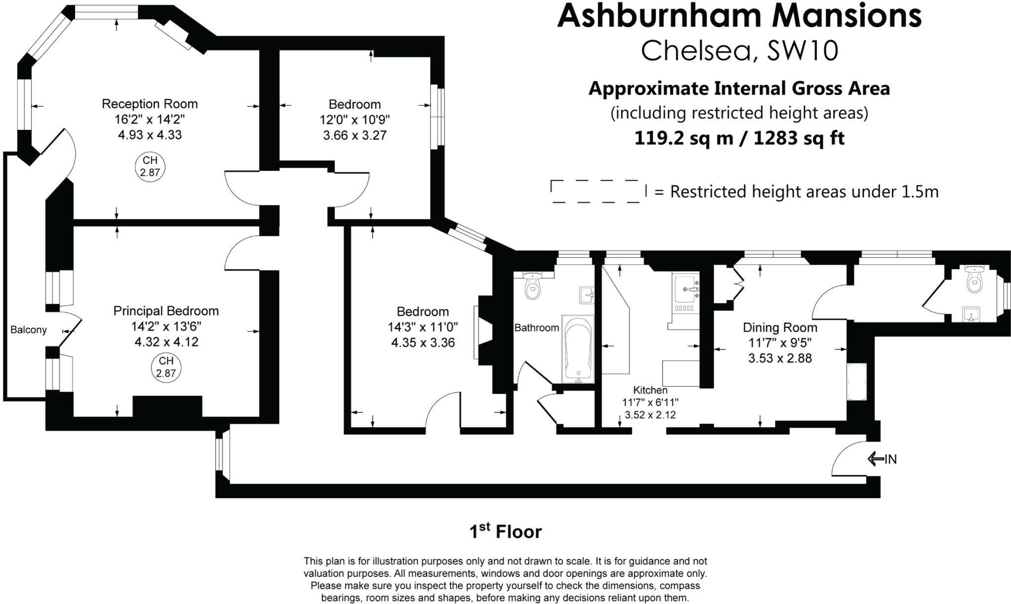 This property is a 3-bedroom apartment located in the desirable Chelsea Riverside area of London. The apartment is situated within Ashburnham Mansions, a period property with character. While the apartment has a good size (2,730 sq ft) and benefits from a large plot size (1,283 sq ft), the images reveal that it is in need of significant renovation. The kitchen appears to be partially renovated, but other areas show signs of wear and tear. The location is excellent, with several outstanding schools and good transport links nearby. However, the list price of £1,150,000 is slightly below the average price for the area (£1,575,222), but considering the required renovations, it may be considered fair. The average price per sqft in the area is £1,401, while this property is listed at approximately £421 per sqft. This suggests a potential opportunity for a buyer willing to undertake renovations. The property benefits from a balcony, offering views of the street.