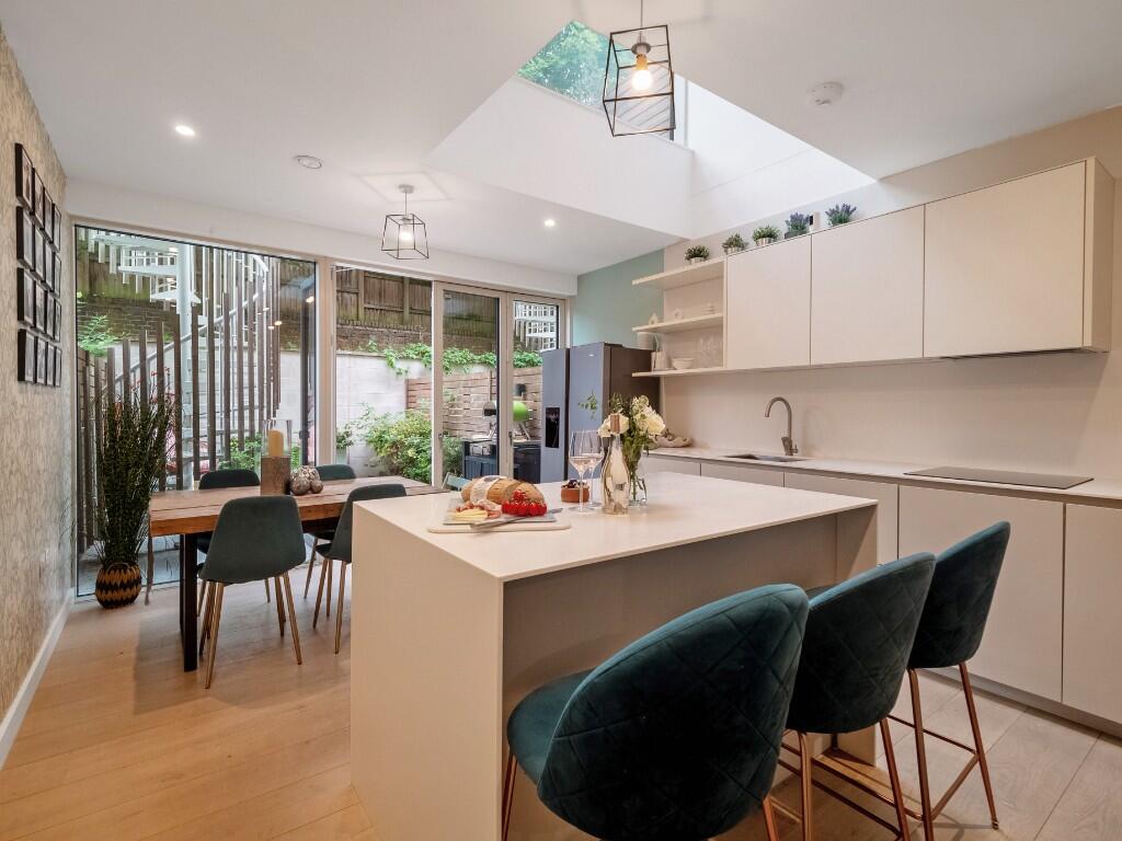 This is a well-presented terraced house in a sought-after location. The property boasts modern interiors, a private garden, and a roof terrace. While the price appears high compared to the local average, the property’s size and features may justify the premium. The proximity to good schools and transportation links further enhances its appeal.