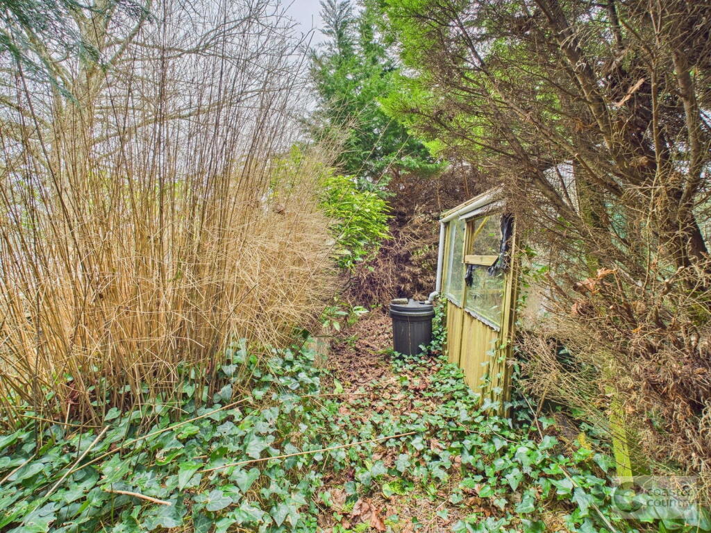 Mature detached bungalow for improvement with driveway, garage and good-sized plot.