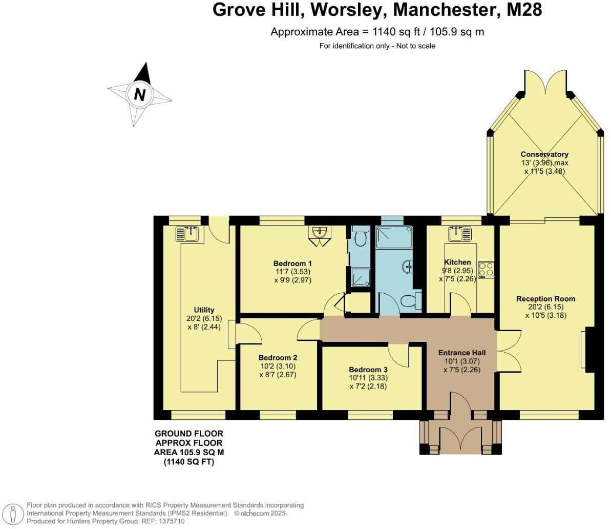 This is a detached bungalow in Worsley, Manchester, presented by Hunters estate agents. The property features three bedrooms and two bathrooms, with a square footage of approximately 1,139.90 sqft. It includes a garden and off street parking. While the property is located in a desirable area with good access to schools and transportation, the interior is in need of modernisation. The asking price of £450,000 appears reasonable considering the location and property size, but potential buyers should factor in the cost of renovations.