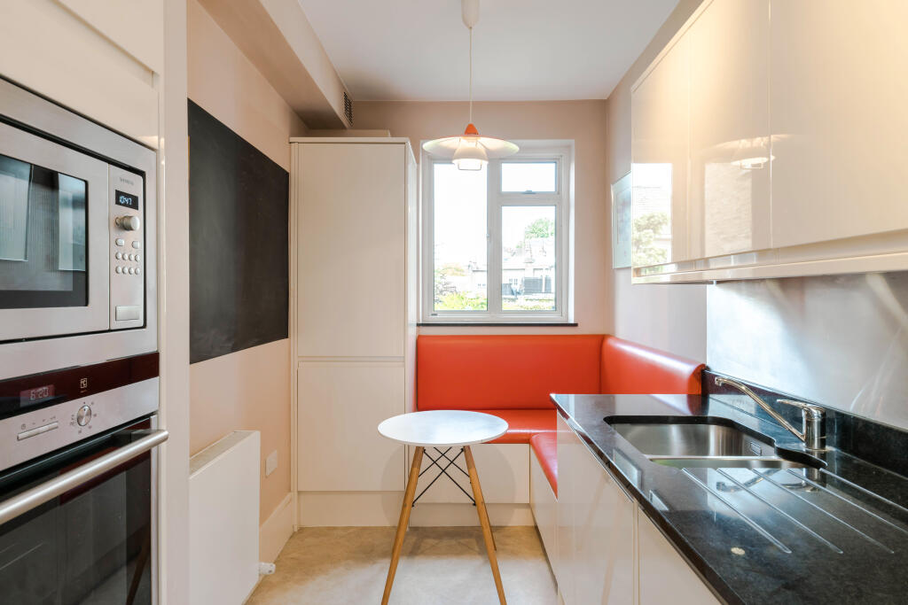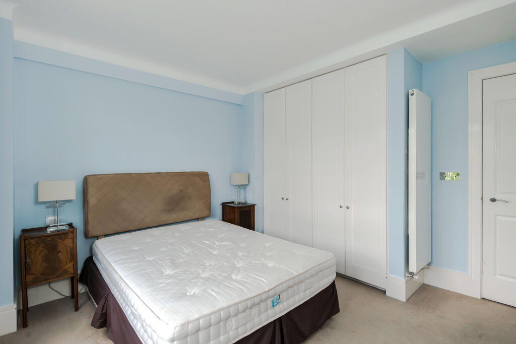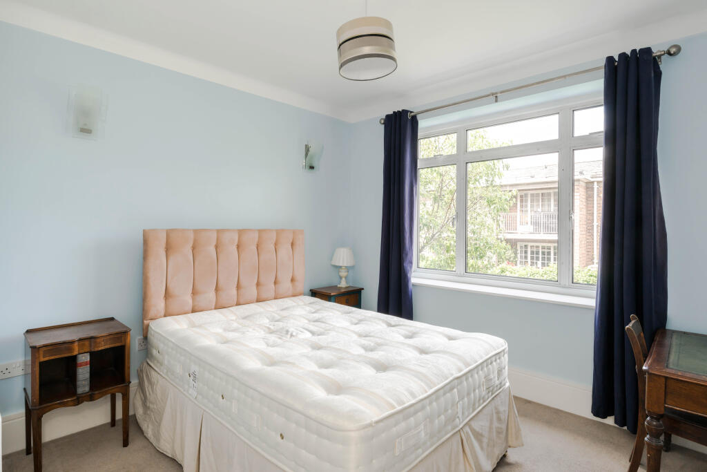 A spacious, two-bedroom, first floor flat (circa 850 sqft) with a charming south facing drawing room with three floor to ceiling French windows leading to an ornamental balcony.