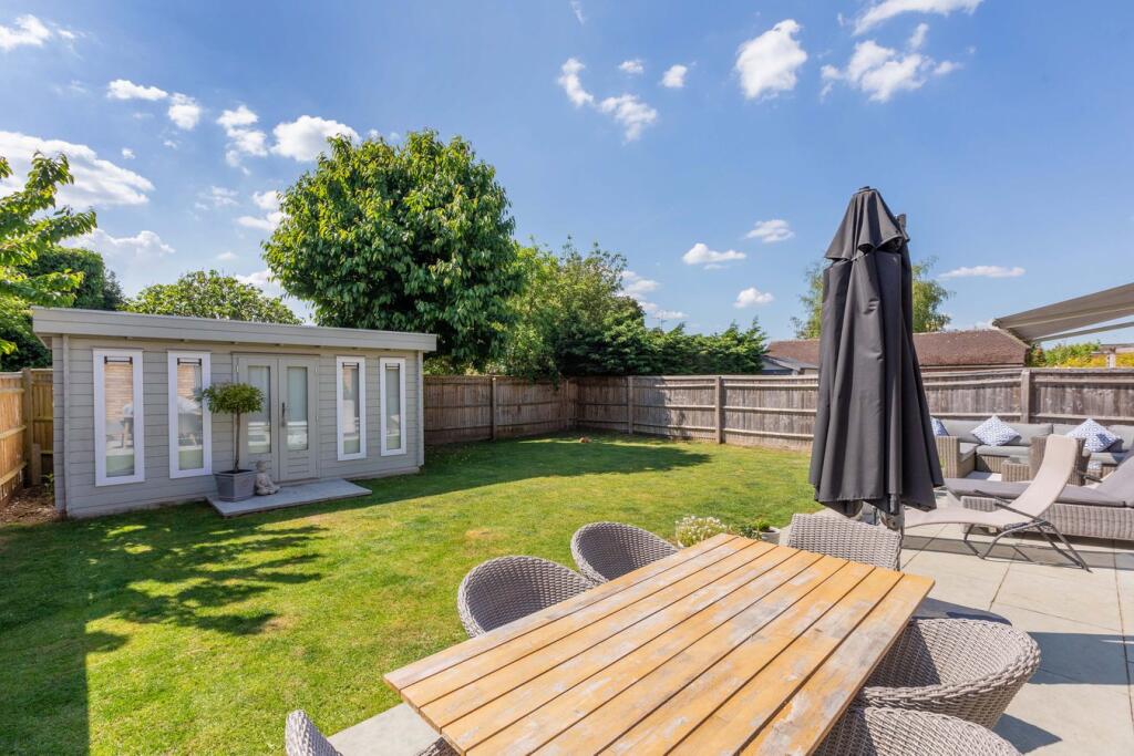 The property appears to be in excellent condition, having undergone a recent and high-quality renovation. The kitchen and bathrooms are modern and well-equipped. The images show a stylish interior with updated fixtures and fittings throughout. The garden is well maintained and includes a patio area, lawn, and a substantial garden shed/summer house. The property benefits from a good-sized plot, offering ample outdoor space.