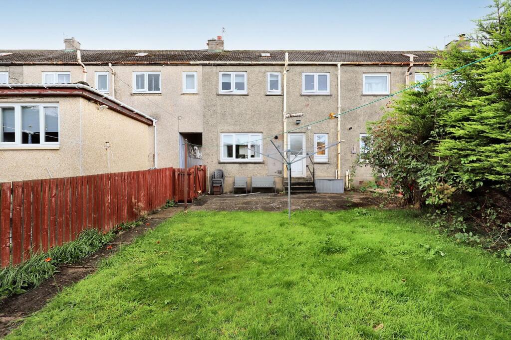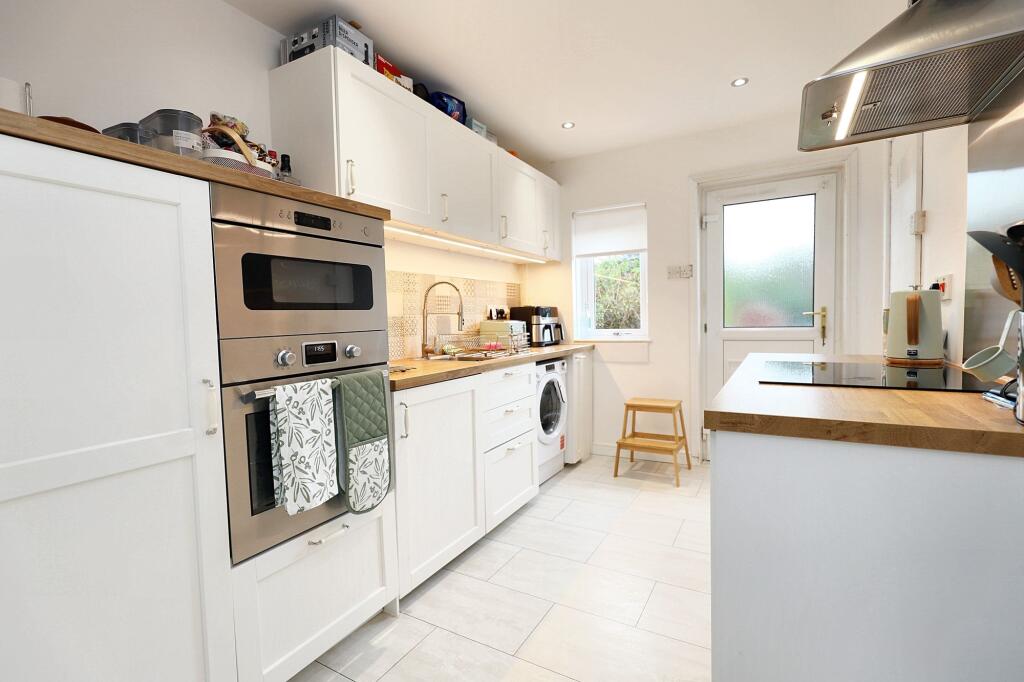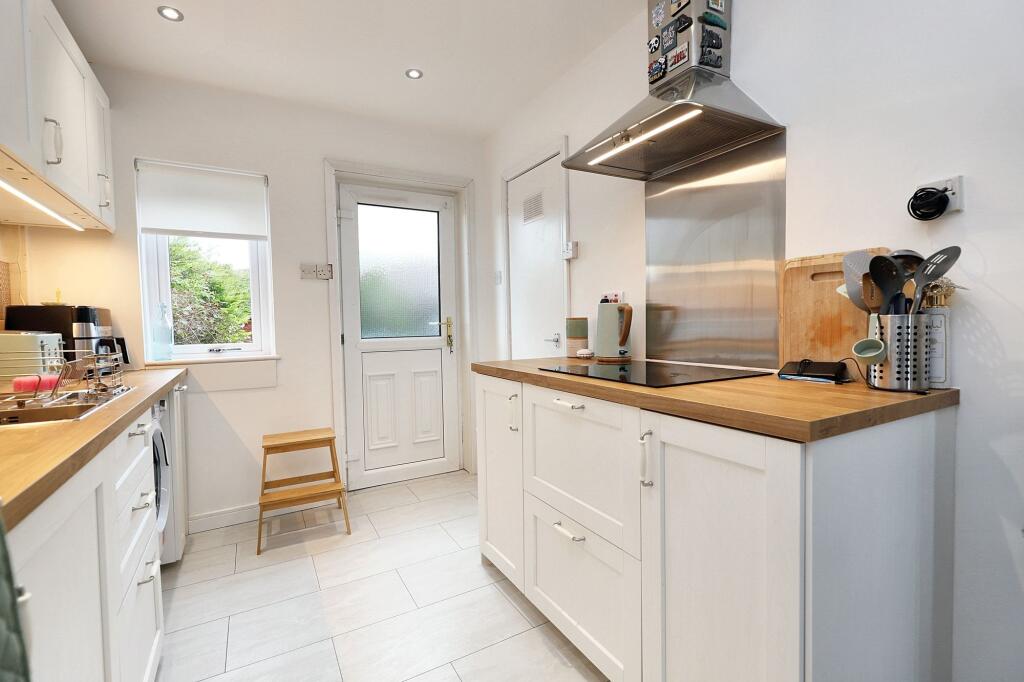 This is a two-bedroom terraced house in Coatbridge West. The property benefits from a modern interior, including an updated kitchen and bathroom. It features both front and rear gardens, with the rear garden offering a decent outdoor space. While the price per square foot is higher than the local average, the overall condition and recent updates justify the asking price. The property is also located within a reasonable distance of Kirkwood train station, providing convenient transportation links.