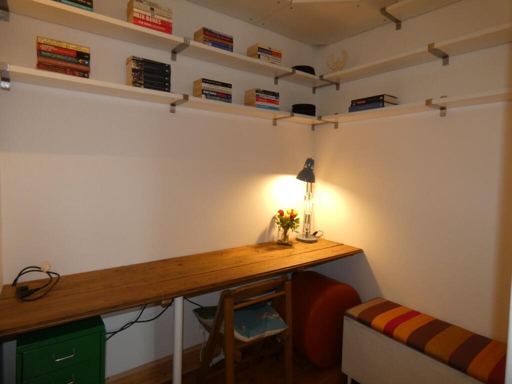 Well presented one bedroom flat located on the second floor in traditional maintained tenement building on Broughton Road. The flat has a combined living and kitchen area, one large bedroom, one large box room (used as a study) and a bathroom.