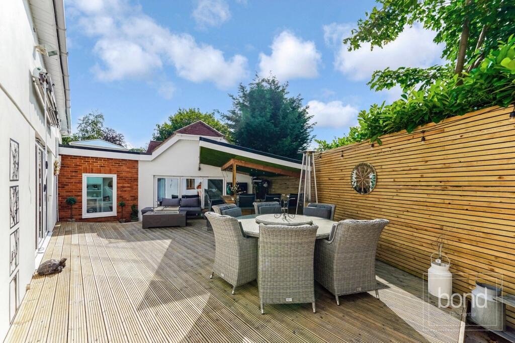 A detached property located in Danbury, Essex. The property has 5 bedrooms and 3 bathrooms. It benefits from a modern kitchen, a well-maintained garden with a pool, a patio area with an outdoor bar, and an office.
