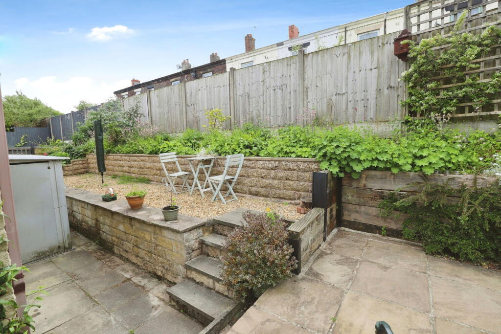 The property includes a garden, which is a significant feature, especially for properties in this area. The garden is tiered with a patio area and various plants and shrubs.