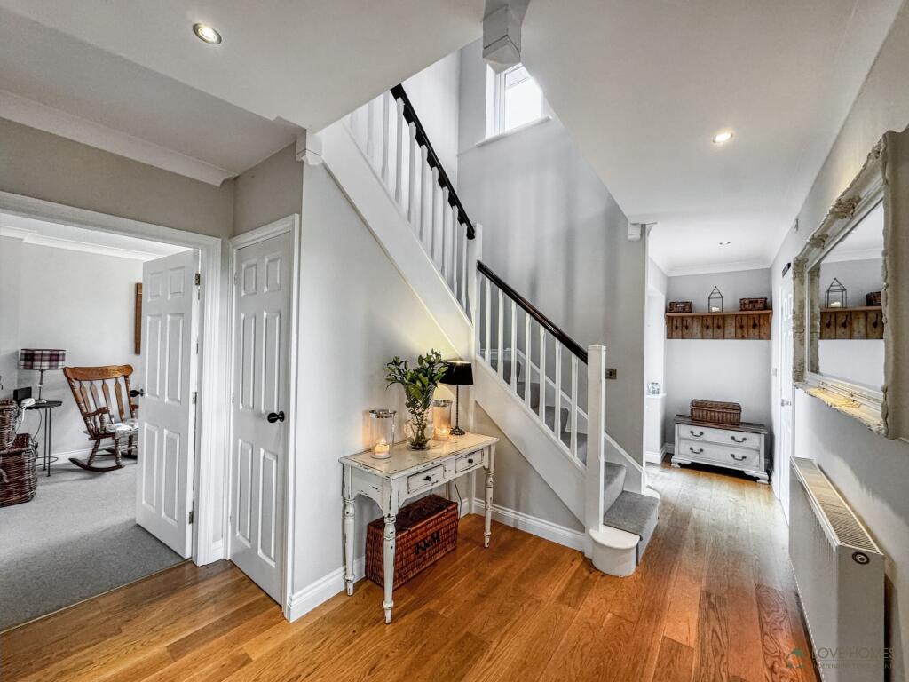 Spacious family home in the heart of Goosnargh, tucked away yet close to schools, shops, restaurants, and pubs. Four bedrooms, three reception rooms, modern kitchen, utility, double garage, and wraparound gardens with countryside views. Excellent M6 access for commuting.