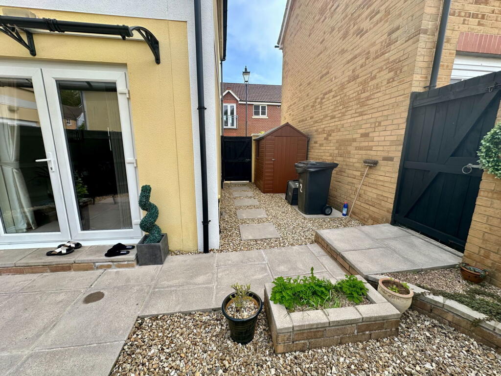 The house itself appears to be in good condition based on the provided images. It presents a modern, clean aesthetic throughout, with a well-maintained kitchen and bathrooms. The garden is relatively small but well-maintained and offers a private paved patio area, perfect for outdoor seating. The inclusion of a small shed provides additional storage space.