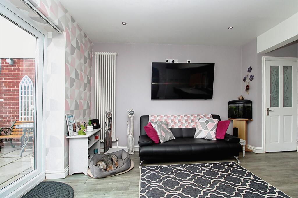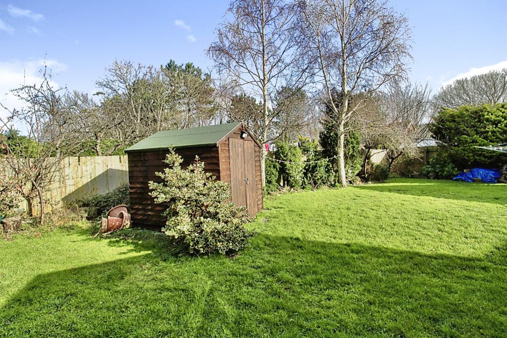 The property benefits from a good-sized rear garden, with two sheds providing ample storage. The images show a modern kitchen and bathrooms, suggesting the property is in good condition. The interior is presented well and appears to have been recently updated.
