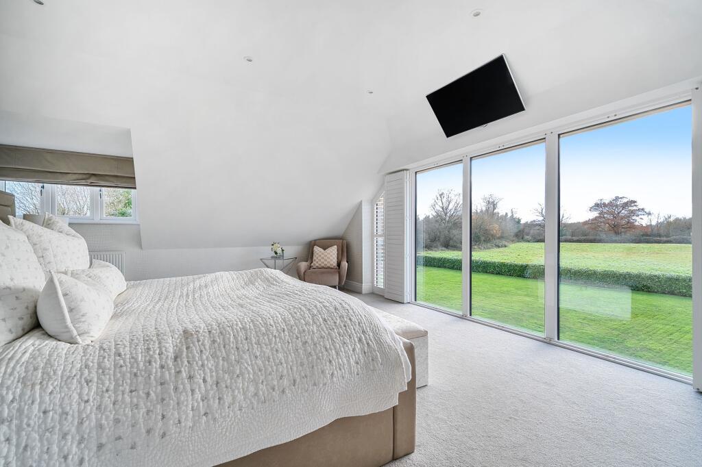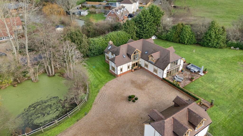 This is a substantial detached property located in Laddingford, Maidstone. The house features four bedrooms and three bathrooms. The images suggest the property is in excellent condition, with modern interiors and a well-maintained exterior. It benefits from a large garden, a pond, and ample parking. While the location is relatively rural, it is within a reasonable distance of schools and transport links. The price is high compared to the average in the area.