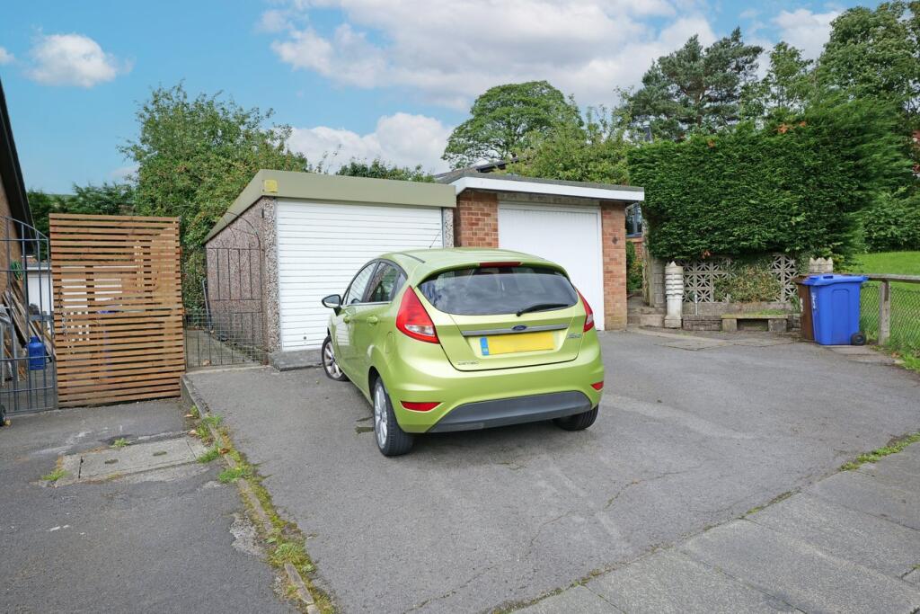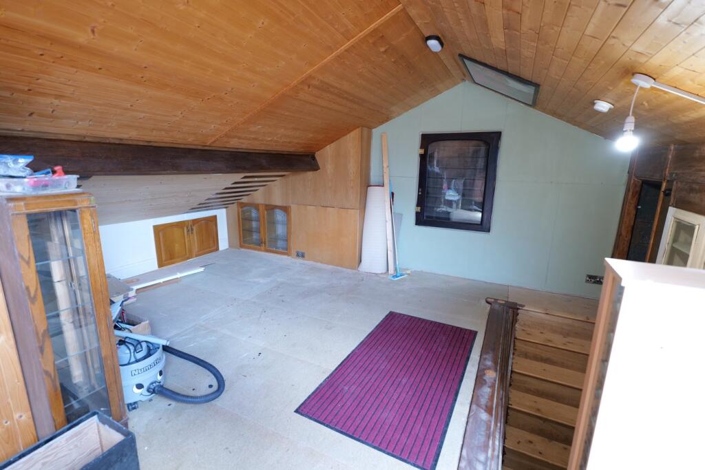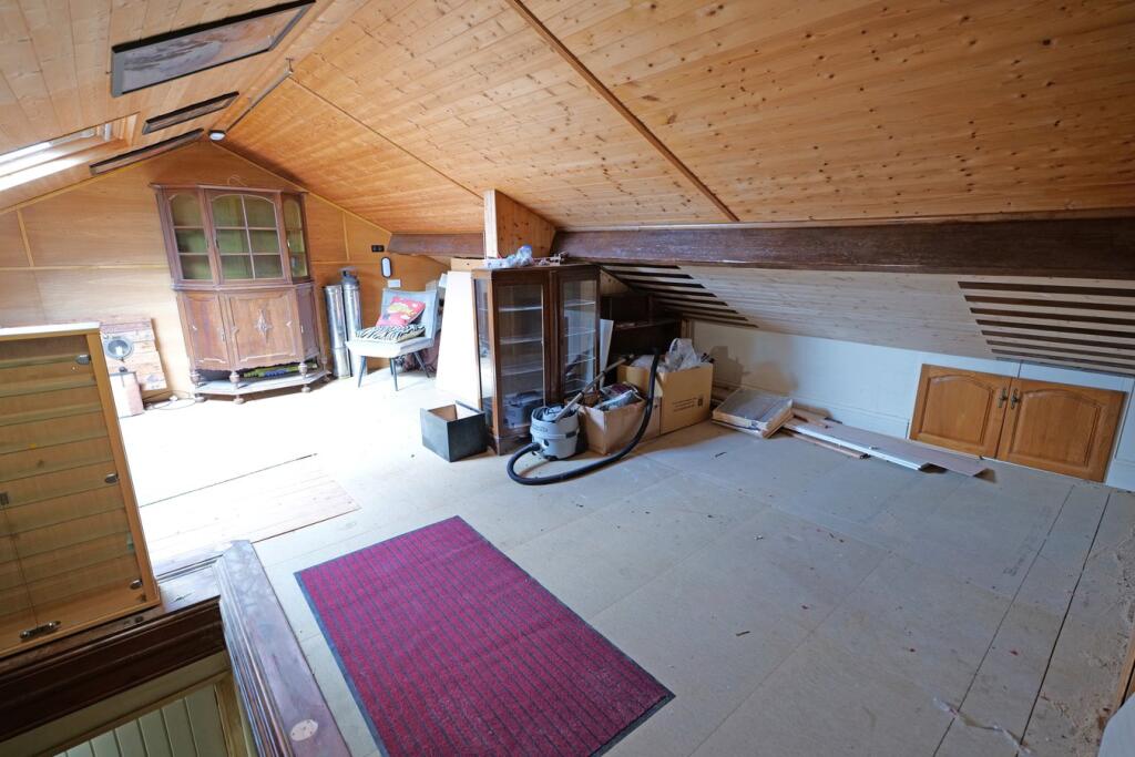 This is a two-bedroom semi-detached bungalow located in Colne, Lancashire. The property is listed for £259,950. The property is located in a residential area and is close to local schools and transportation links. The property has a garden and patio area. The interior of the property is in reasonable condition, although some aspects of the interior design might be considered dated. The attic space appears unfinished and may require renovation.