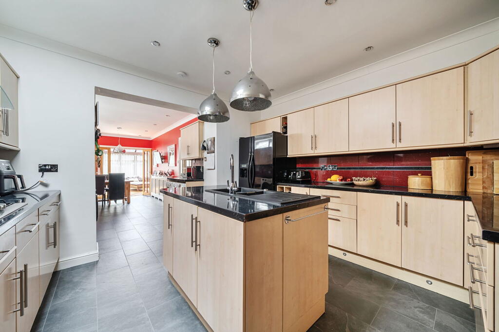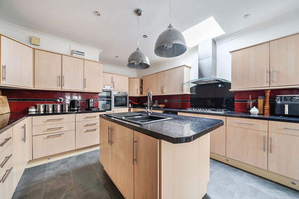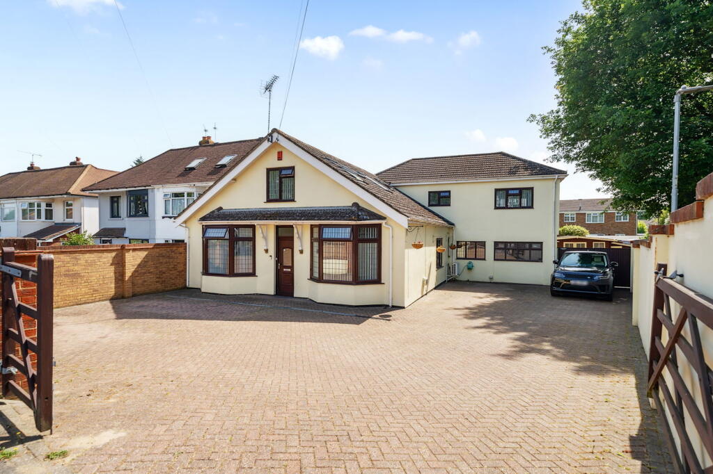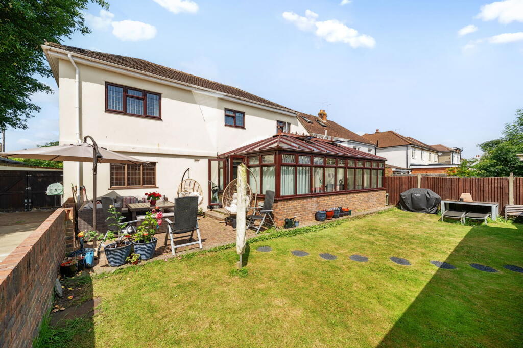 A substantial detached home on Maidstone Road, Rainham Central, Medway, Kent. The property boasts 5 bedrooms, 2 bathrooms, and a generous 3,283 square feet of living space. Key features include a large driveway with parking for 10 cars, a conservatory, and a garden with an outbuilding converted into a bar. The location is ideal for families, with proximity to reputable schools and convenient transportation links. While the list price of £700,000 exceeds the area average, the property offers significantly more space and a lower price per square foot, indicating good value. The interior appears well-maintained with modern amenities.