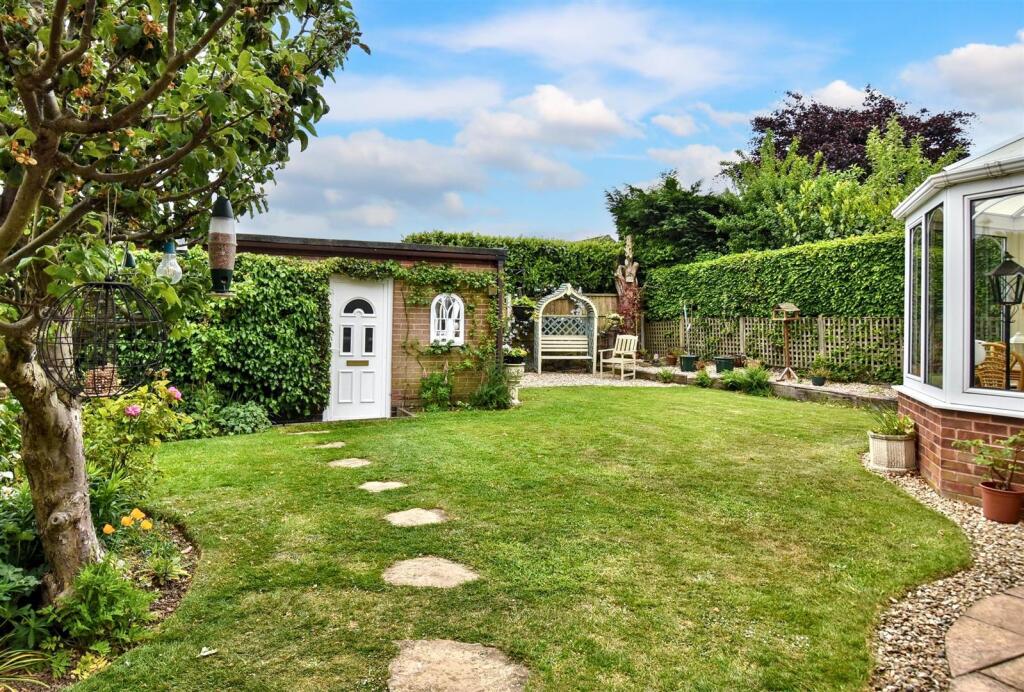 The property includes a substantial garden, offering ample outdoor space. The garden is well-maintained and features a patio area, mature plants, and a shed. This adds to the overall appeal and value of the property.