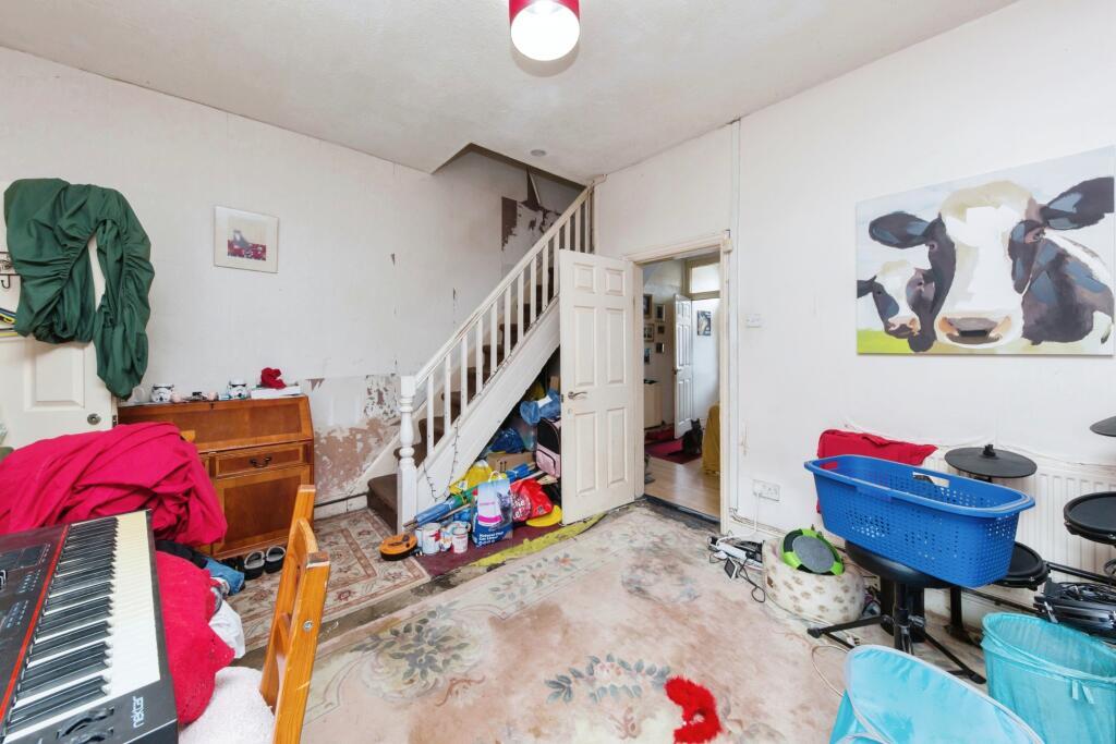 This is a three-bedroom terraced house located on Ionic Street in Rock Ferry, Birkenhead. The property is listed for £88,000. It is close to local amenities such as Rock Ferry Primary School and the Rock Ferry train station. The property requires significant renovation, as evidenced by the peeling paint, dated decor, and worn interiors. It includes a small rear garden. The price per square foot is significantly below the local average, reflecting the property’s condition and the investment needed for modernisation.
