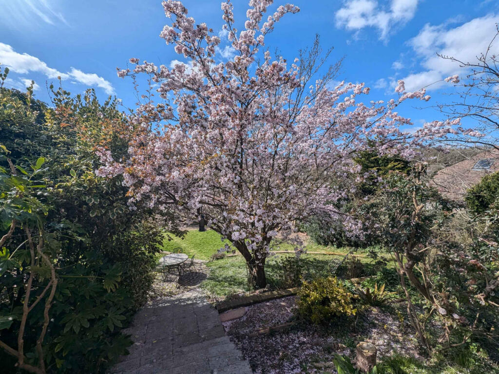 The property includes a sizeable garden with mature trees and a patio area, offering outdoor space and pleasant views of the surrounding countryside. The garden appears to be well-established, providing a tranquil and private setting.