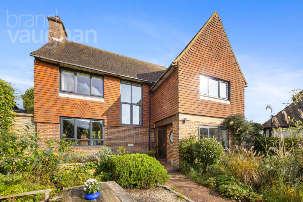 Just 10 mins drive from Brighton with views over a glorious coastal setting, this sunlit 4 bed detached house with off street parking backs onto open countryside and has idyllic gardens where a summer house has a wood burning stove, a detached timber cabin has power and a greenhouse delivers flow...