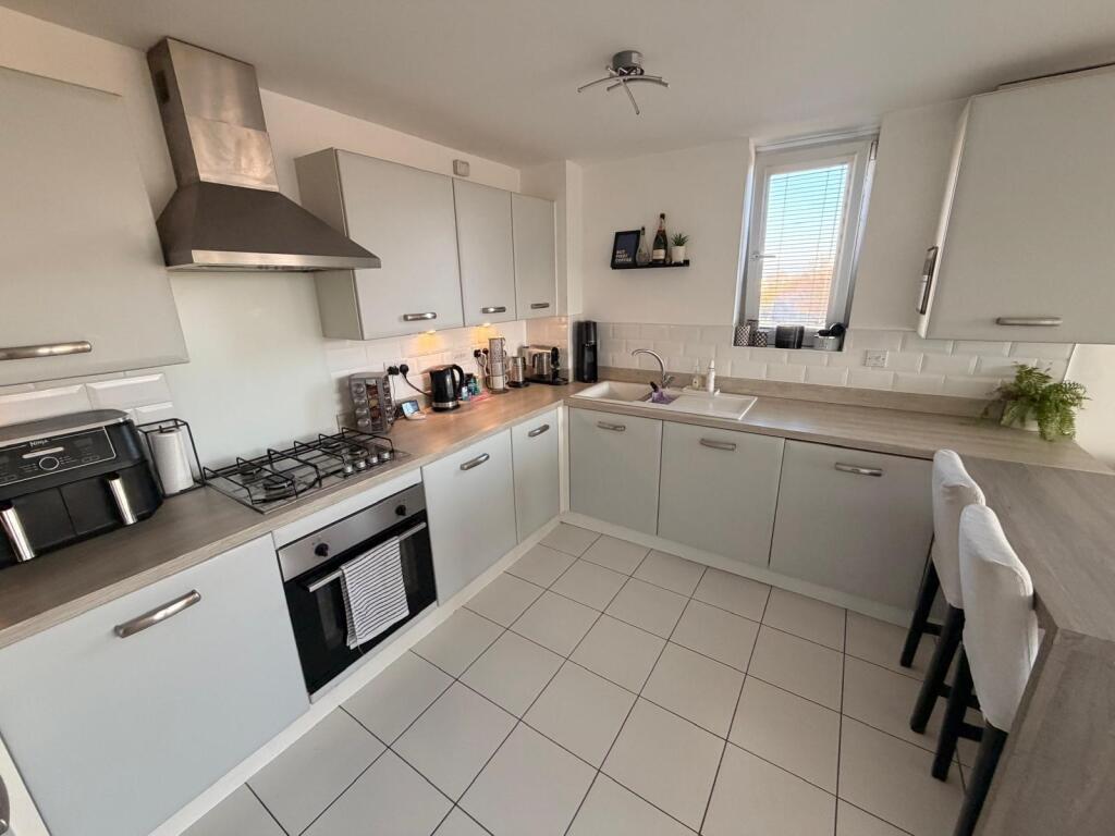 This is a modern two-bedroom apartment located in Emersons Green, Bristol. The property appears to be in good condition, with a modern interior. It features a well-equipped kitchen, a bathroom, and a balcony. While it doesn’t have a garden, its location offers proximity to local schools and amenities. The asking price of £240,000 seems reasonable when compared to the average property prices in the area.