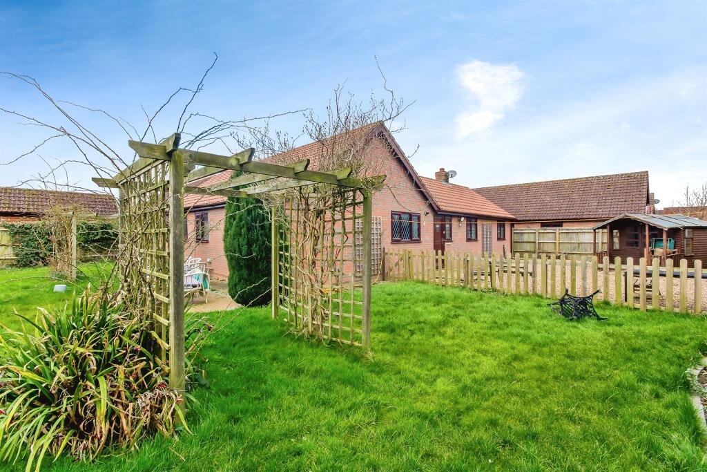 The property is a 3 bedroom detached bungalow situated in Grange Meadows, Sibsey, Boston, Lincolnshire. The property is listed at £270,000 and has 1350 sqft of living space. The average price for properties in the Sibsey & Stickney area is £272,979 with an average size of 1387 sqft. The average price per sqft is £196. Given the property’s size and location, the list price appears reasonable, although further analysis of the property’s condition is needed to determine if it represents good value. The property benefits from being close to The Sibsey Free Primary School (rated ‘Good’ by Ofsted), located just 0.39km away. This is a positive aspect for families. Boston, with its East Midlands Railway connection, is approximately 8.23km away, providing access to wider transportation networks. Based on the provided images, the property appears to be in generally good condition, although some areas could benefit from modernisation. The kitchen has recently been updated with modern teal cabinets and white subway tiles, however, other areas such as the living room show signs of wear and tear. There is evidence of ongoing work or renovations in several rooms. The garden is a good size with a patio area, lawn, and shed. The presence of a garden is a positive feature.