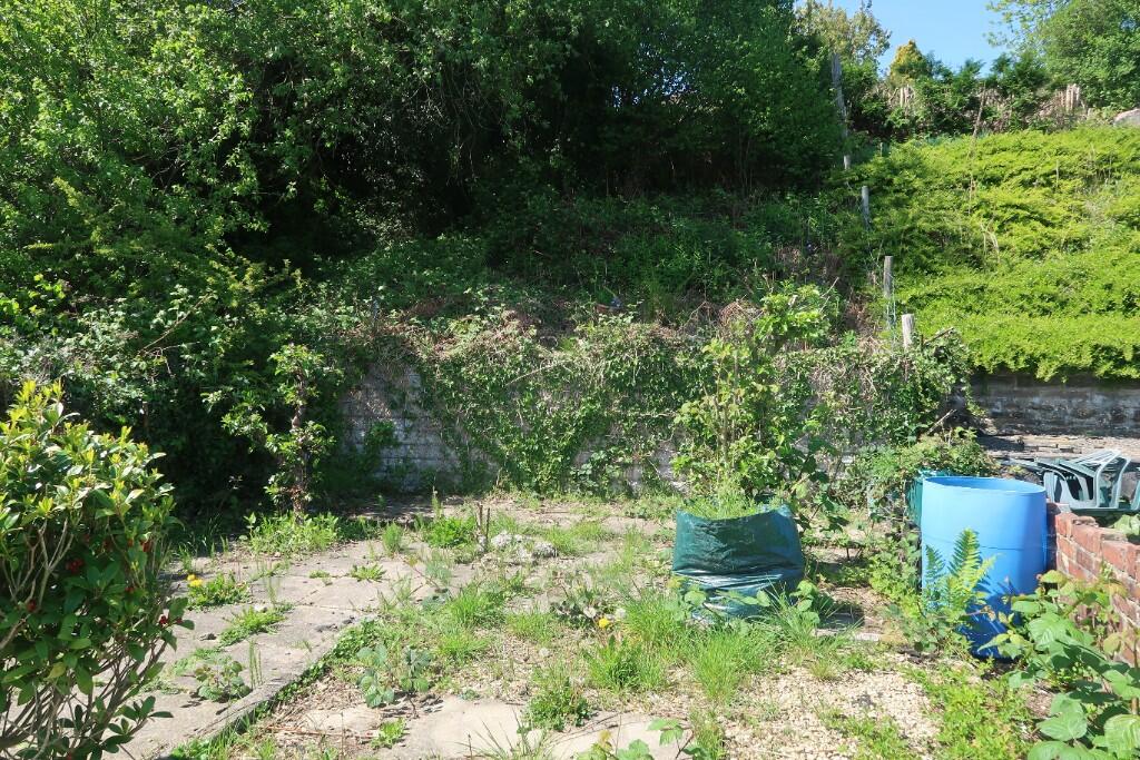 The property itself requires some renovation. The interior images show several rooms with damaged or outdated finishes including exposed plasterboard, worn flooring, and dated decor. The bathroom and kitchen also appear to be in need of modernisation. The garden, while present, is overgrown and requires significant maintenance. The presence of a garage and a small patio area are positive aspects.