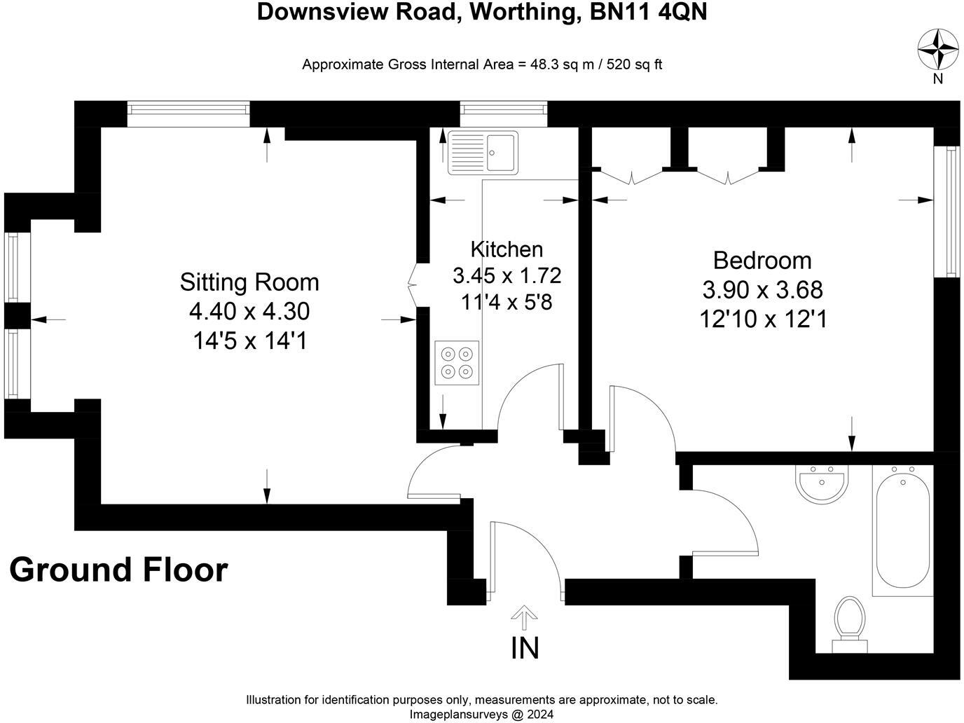 The property is a 1-bedroom, 1-bathroom flat located on Downview Road in Heene, Worthing, West Sussex. It has a plot size of 520 sqft and internal space of 412.42 sqft. The list price is £165,000.
