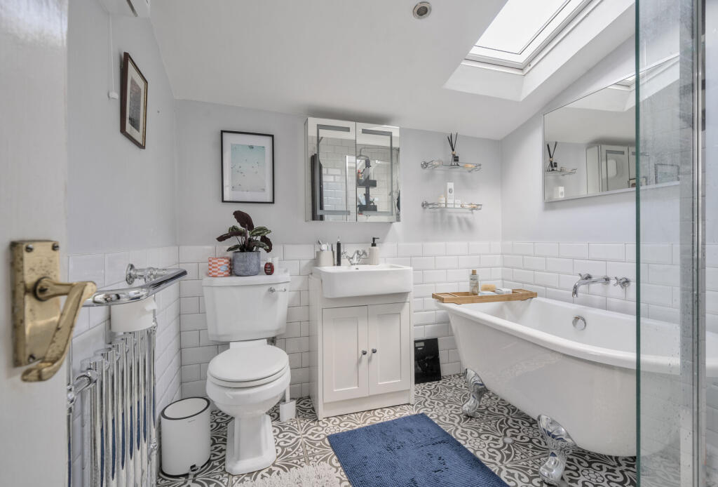 The property appears to be in good condition. The images show a recently renovated interior with a modern kitchen and bathroom. There is a small garden to the rear of the property. The garden is relatively small but well-maintained and includes a shed and decking area.