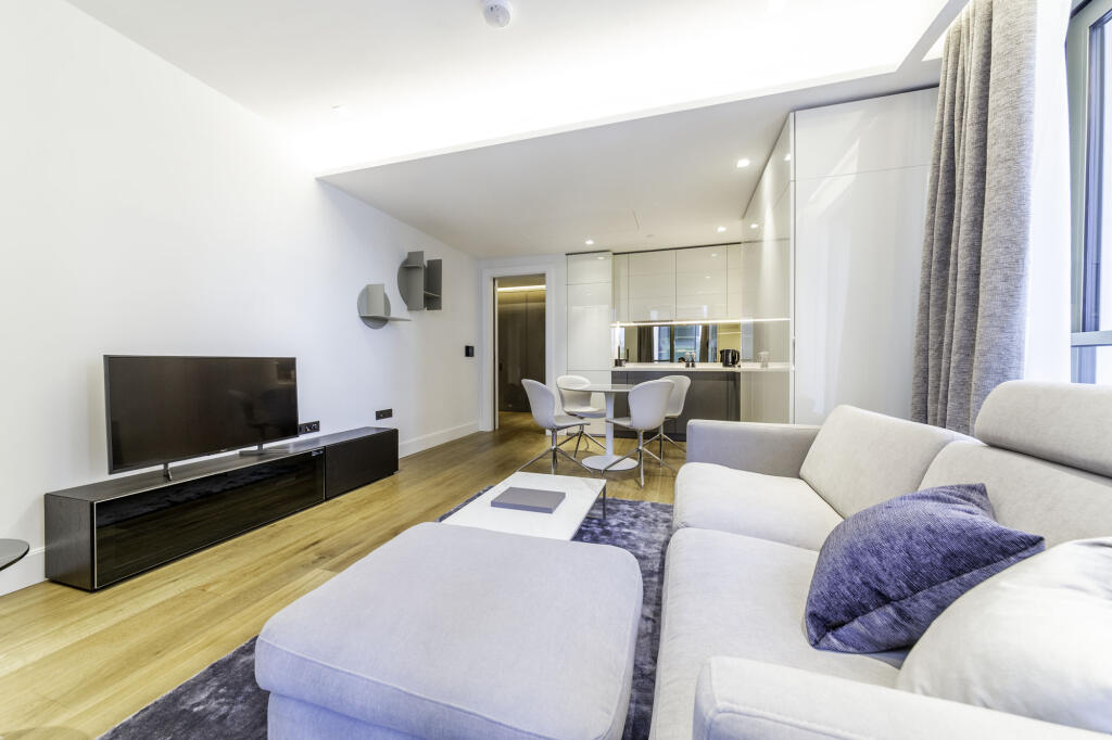 This impressive one-bedroom apartment features spacious, light-filled interiors with a large entrance hall, bespoke storage, and a high-spec control system. The open-plan living/dining area includes floor-to-ceiling Juliette balconies, wooden floors, underfloor heating, and cooling. A designer ki...