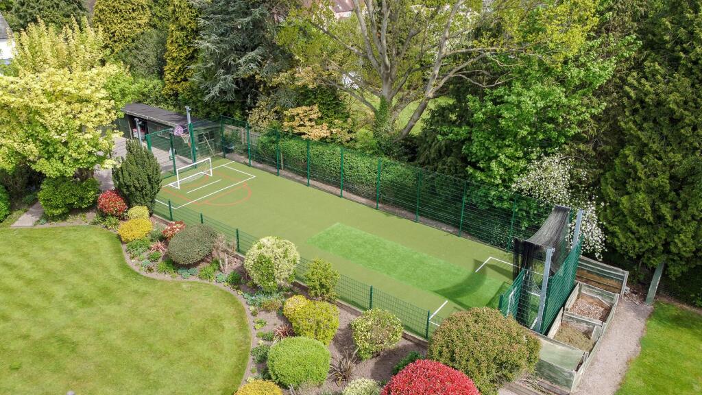 Land: The property boasts extensive grounds, including a large lawn, landscaped gardens, and a dedicated sports area. The size of the plot is not explicitly stated, but the aerial views clearly indicate a substantial amount of land, significantly more than the average for properties in the area. This adds considerably to the property’s value and desirability.
