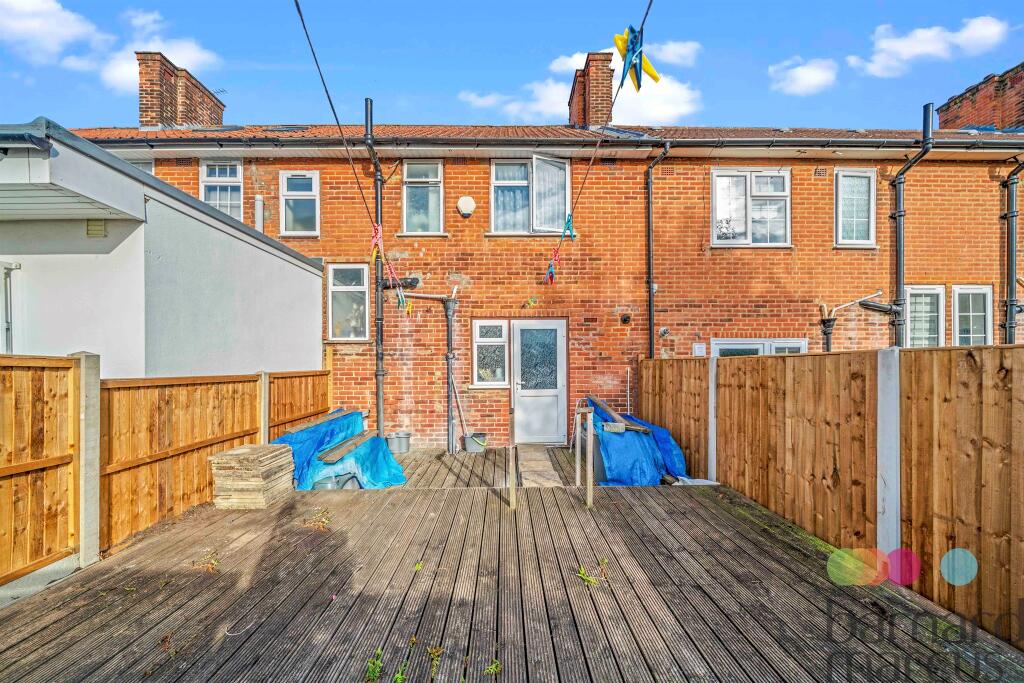 This is a two-bedroom terraced house located on Grange Road in Edgware. The property is in a suburban area with access to local amenities, schools, and transportation. The property has a rear garden, which is mainly decking, and a front garden, which is paved and provides off-street parking. The property appears to be in reasonable condition, but it could benefit from some modernisation. The kitchen and bathroom appear dated. The property is listed for £450,000, which is slightly above the average price for similar properties in the area.