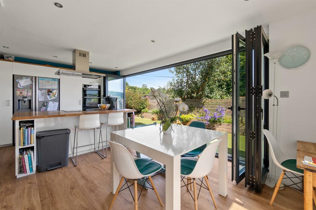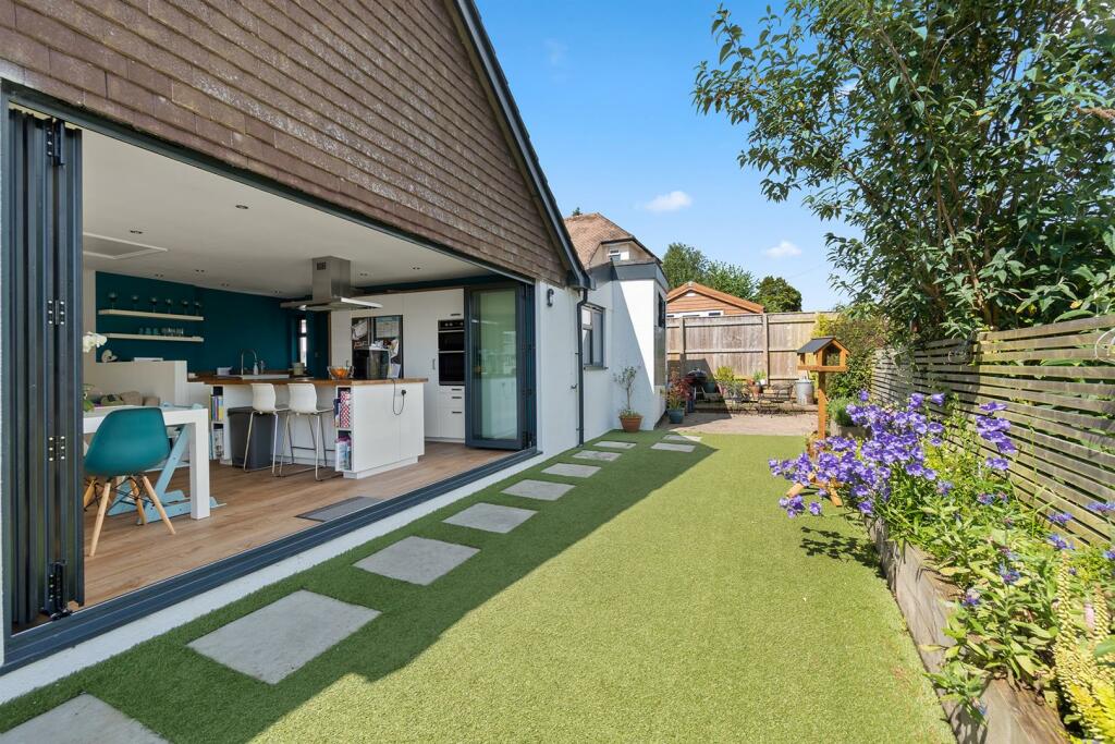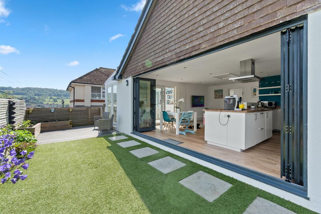 This four-bedroom detached house in Upper Highfield, Sidmouth, presents a well-maintained family home. The property benefits from a recent refurbishment, most notably featuring a modern, open-plan kitchen extension that seamlessly integrates indoor and outdoor living spaces. Large bi-fold doors create a strong visual connection to the rear garden, enhancing the overall appeal. The kitchen itself is sleek and contemporary, while the bathrooms, also renovated, add to the overall modern feel. The use of artificial turf is a notable aspect and may appeal to some buyers due to its low-maintenance nature, while others might prefer natural grass. The inclusion of a conservatory or sunroom provides additional living space, potentially for a home office or play area.