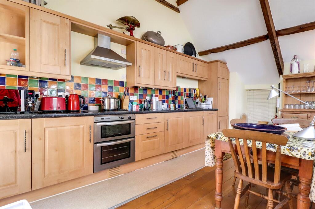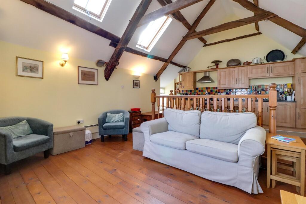 Based on the provided images, the property appears to be in good condition. The interior shows a well-maintained and recently updated kitchen and bathrooms. The exposed beams and wooden flooring add character, suggesting that the property has been renovated to a reasonable standard.