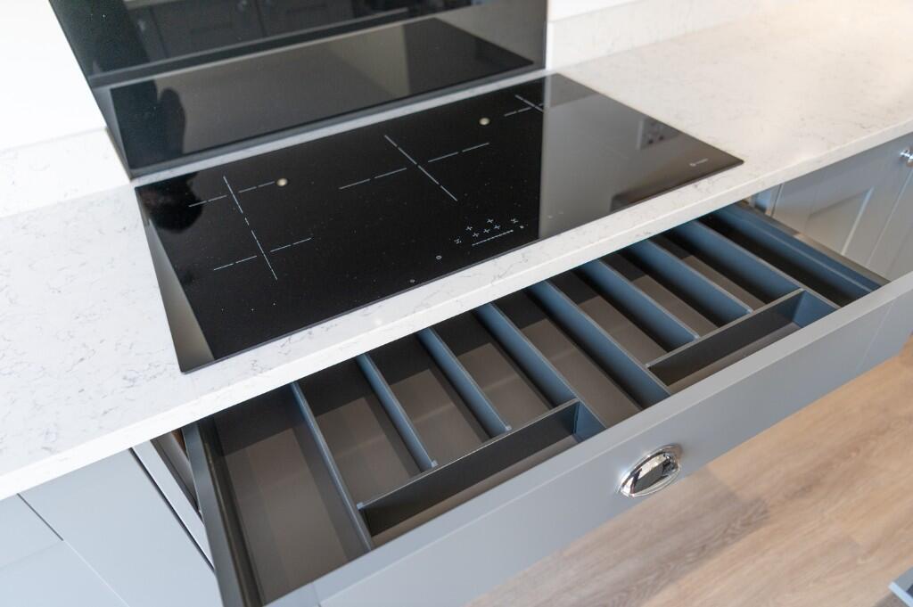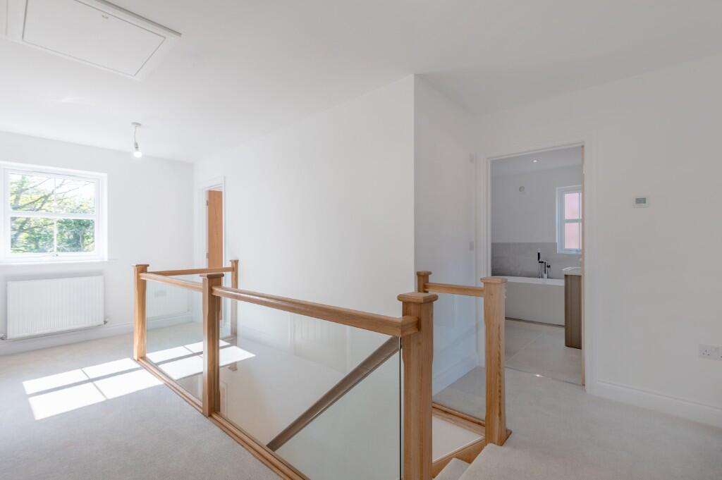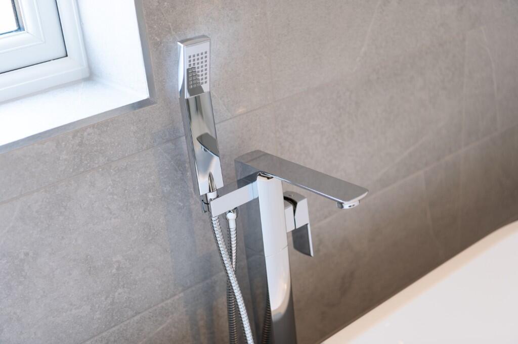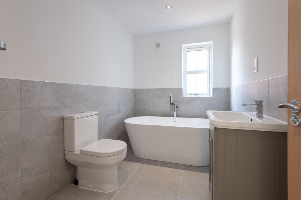 The images show a newly built, modern detached property. It appears to be in excellent condition, with high-quality fixtures and fittings throughout. The kitchen is modern and well-equipped, and the bathrooms are contemporary in design. The property also benefits from a sizeable, enclosed rear garden.