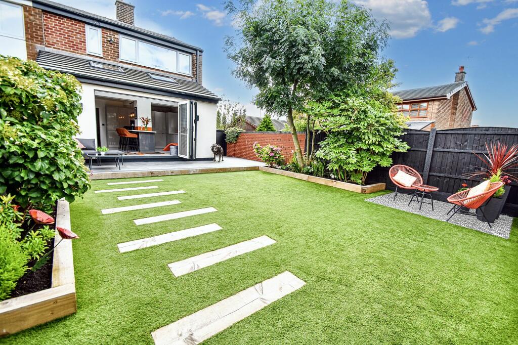 This three-bedroom, two-bathroom property located on Parr Lane in Unsworth, Bury is presented in immaculate condition. The house has clearly undergone a significant refurbishment or renovation, resulting in a modern and stylish interior. The photos showcase a contemporary kitchen with integrated appliances, updated bathrooms with modern fixtures, and well-decorated living spaces. A key feature is the extensive rear garden which has been thoughtfully landscaped, including artificial turf, paving, and attractive planting. The property’s location in Unsworth places it conveniently close to Unsworth Academy, an Ofsted-rated ‘Good’ secondary school, and also within a reasonable distance to several train stations offering commuter links to Manchester. While the exact plot size isn’t available, the images suggest a larger than average garden for this type of property. The list price of £325,000 requires further investigation of similar properties in the exact area to ascertain true value for money, as comparable properties listed have zero square footage specified, hence preventing an accurate per square foot comparison.