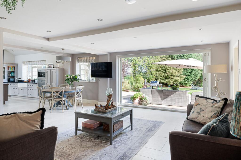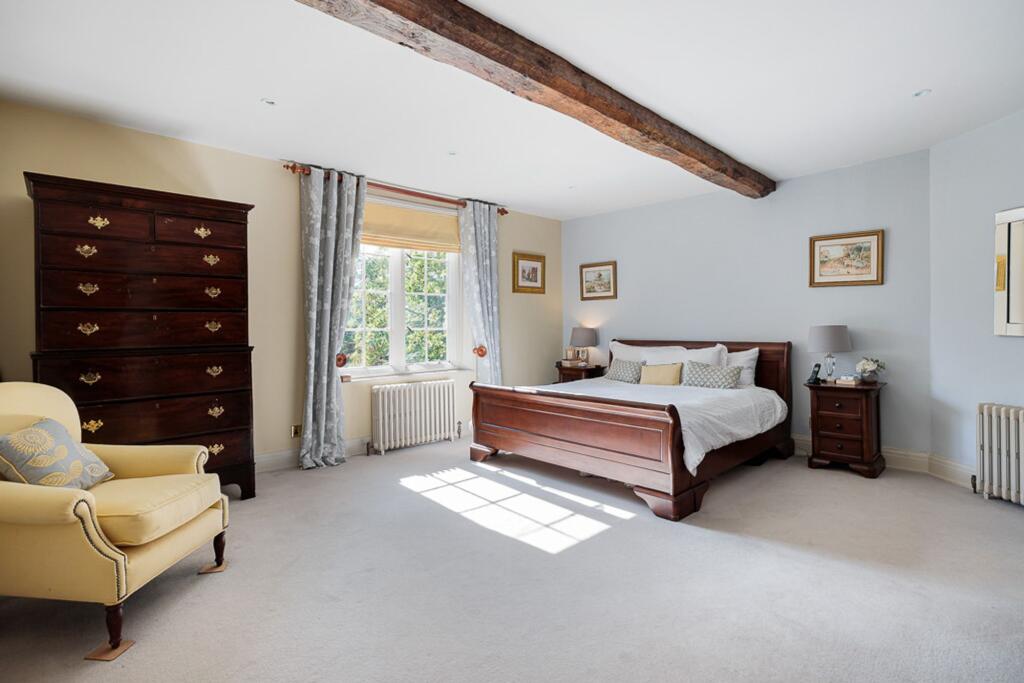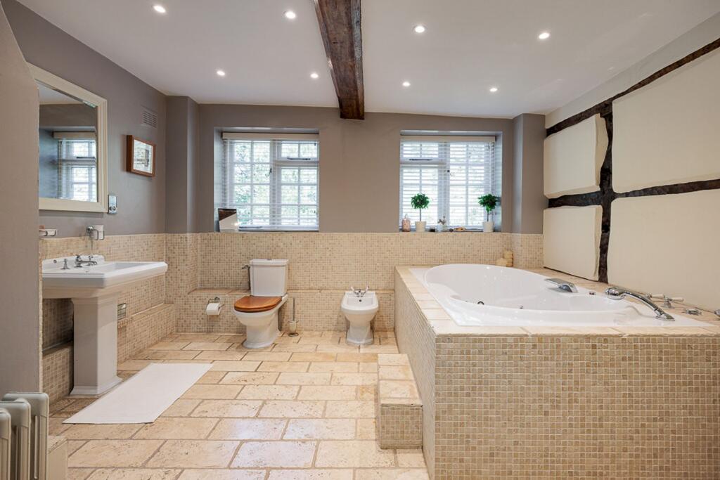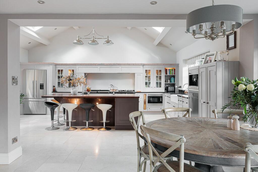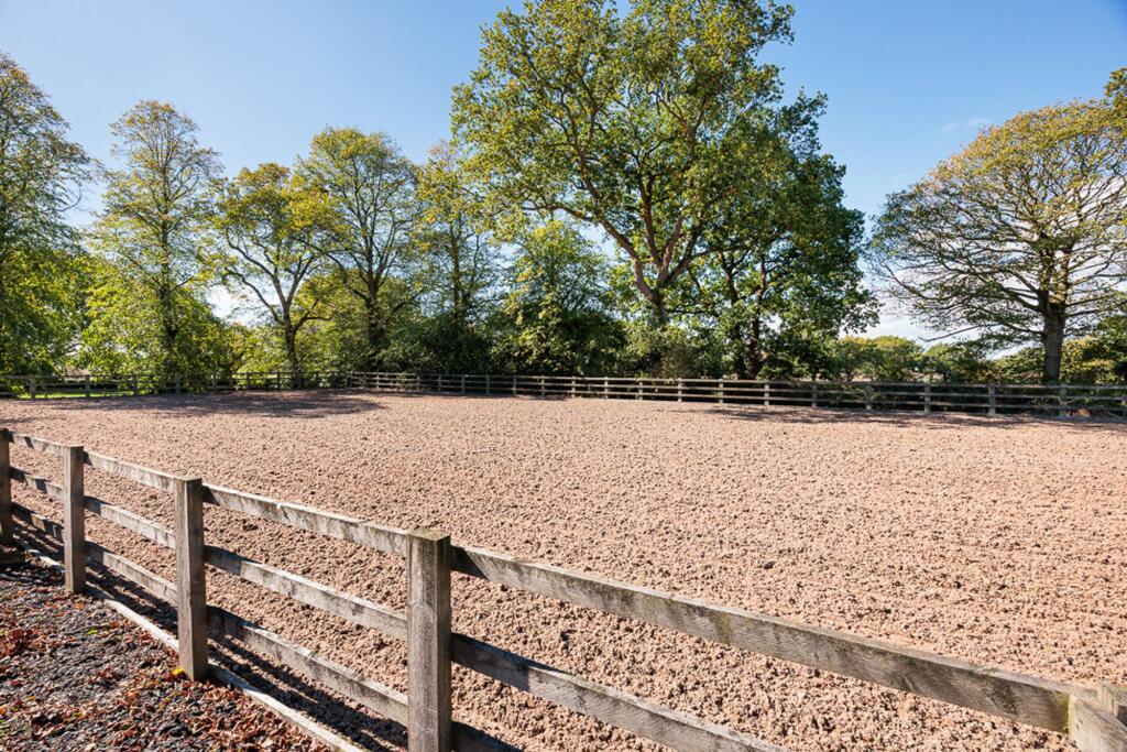 This is a substantial detached property located in Cheshire. The house offers six bedrooms and two bathrooms, making it suitable for a large family. The interior combines period features with modern amenities, as seen in the exposed beams and updated kitchen and bathrooms. Externally, the property benefits from a large plot, including a garden, tennis court, and equestrian facilities. While the location is somewhat remote, it offers a peaceful setting with good access to local schools and transport links. The price is high compared to the local average, but this reflects the size, condition, and unique features of the property.