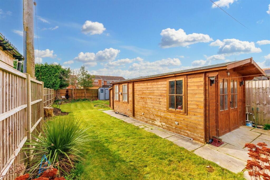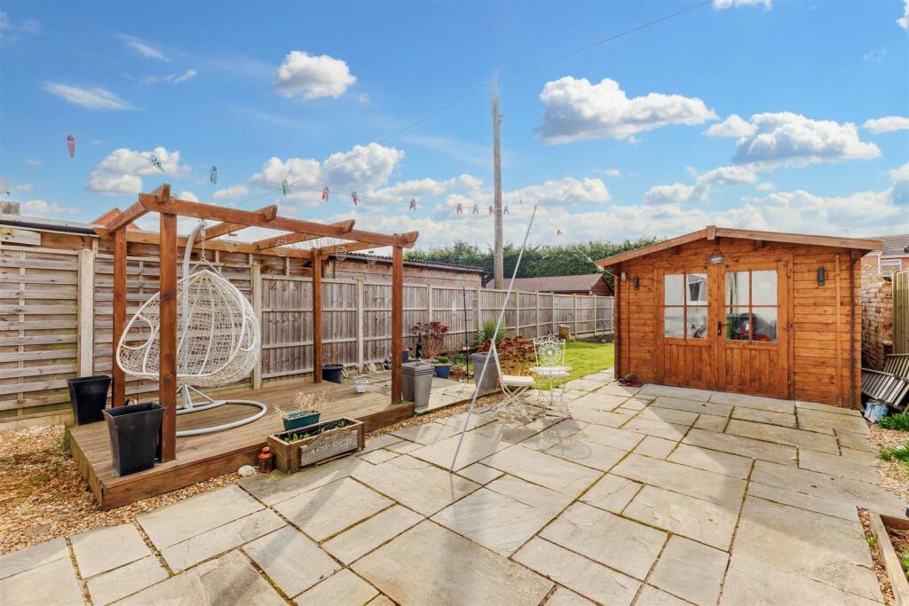 The property has a garden, which is a significant advantage in the current market. The garden includes a patio area and a substantial wooden shed, providing ample outdoor space.