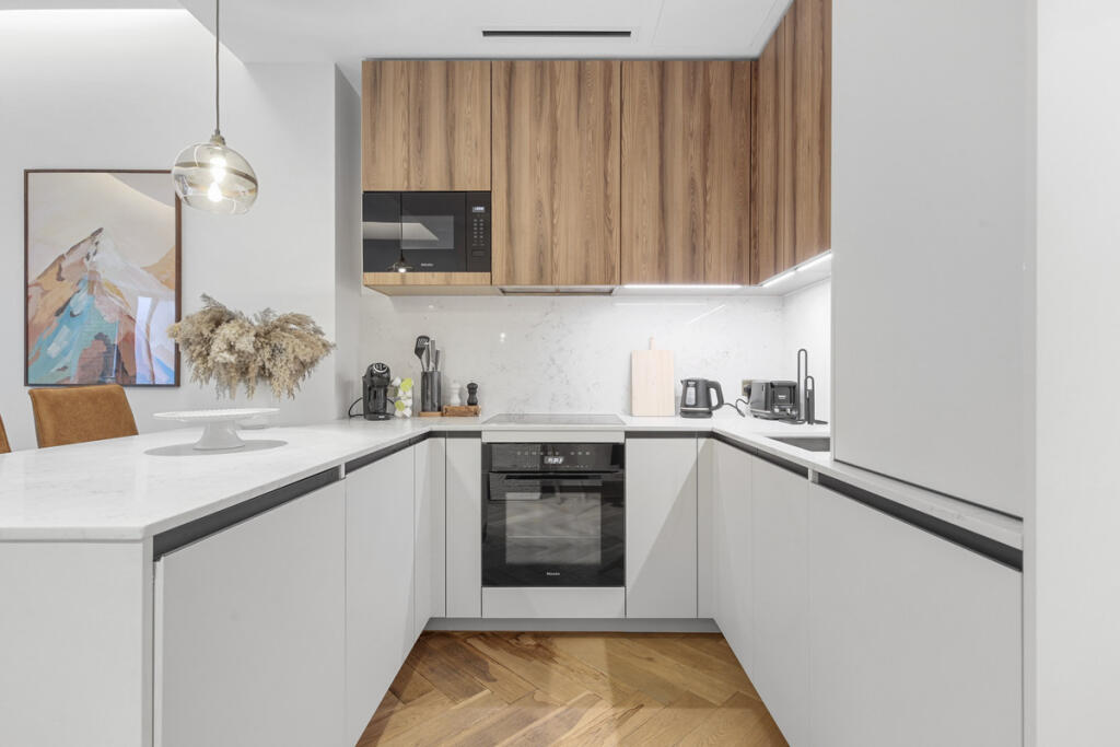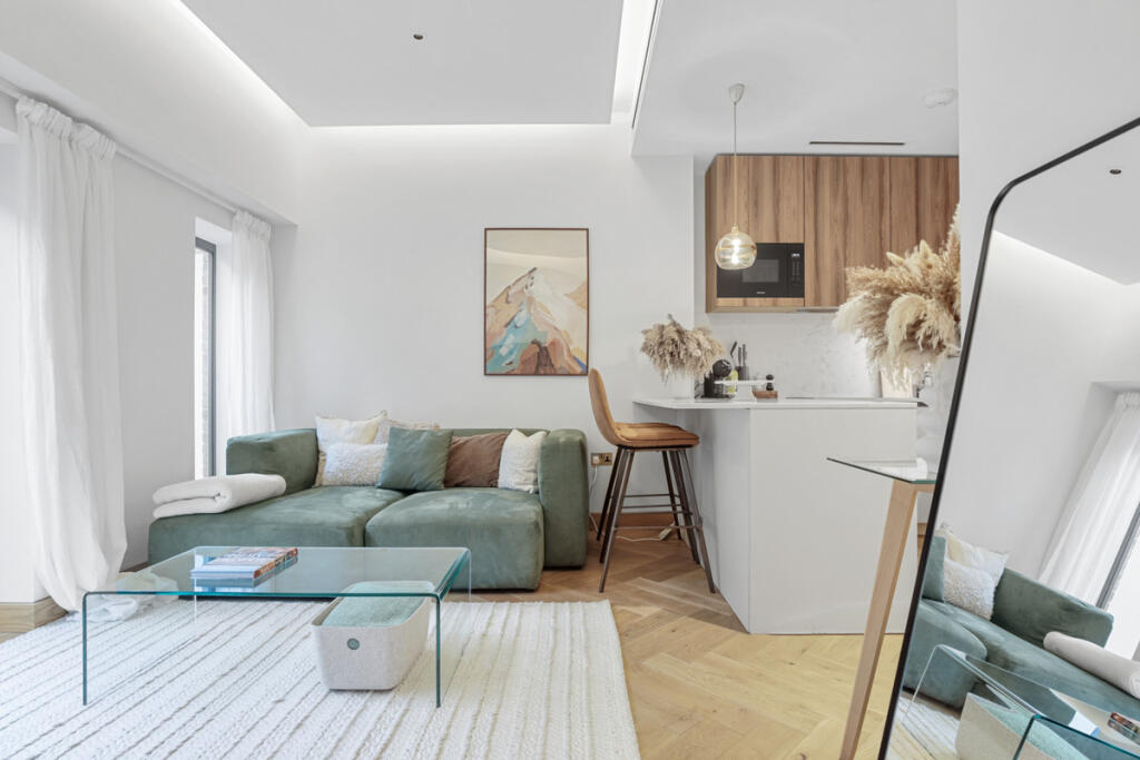 A beautifully designed one-bedroom flat in Marylebone with a large roof terrace, wooden floors, a modern kitchen, lift access, and a quiet position on Baker Street and near Regent’s Park