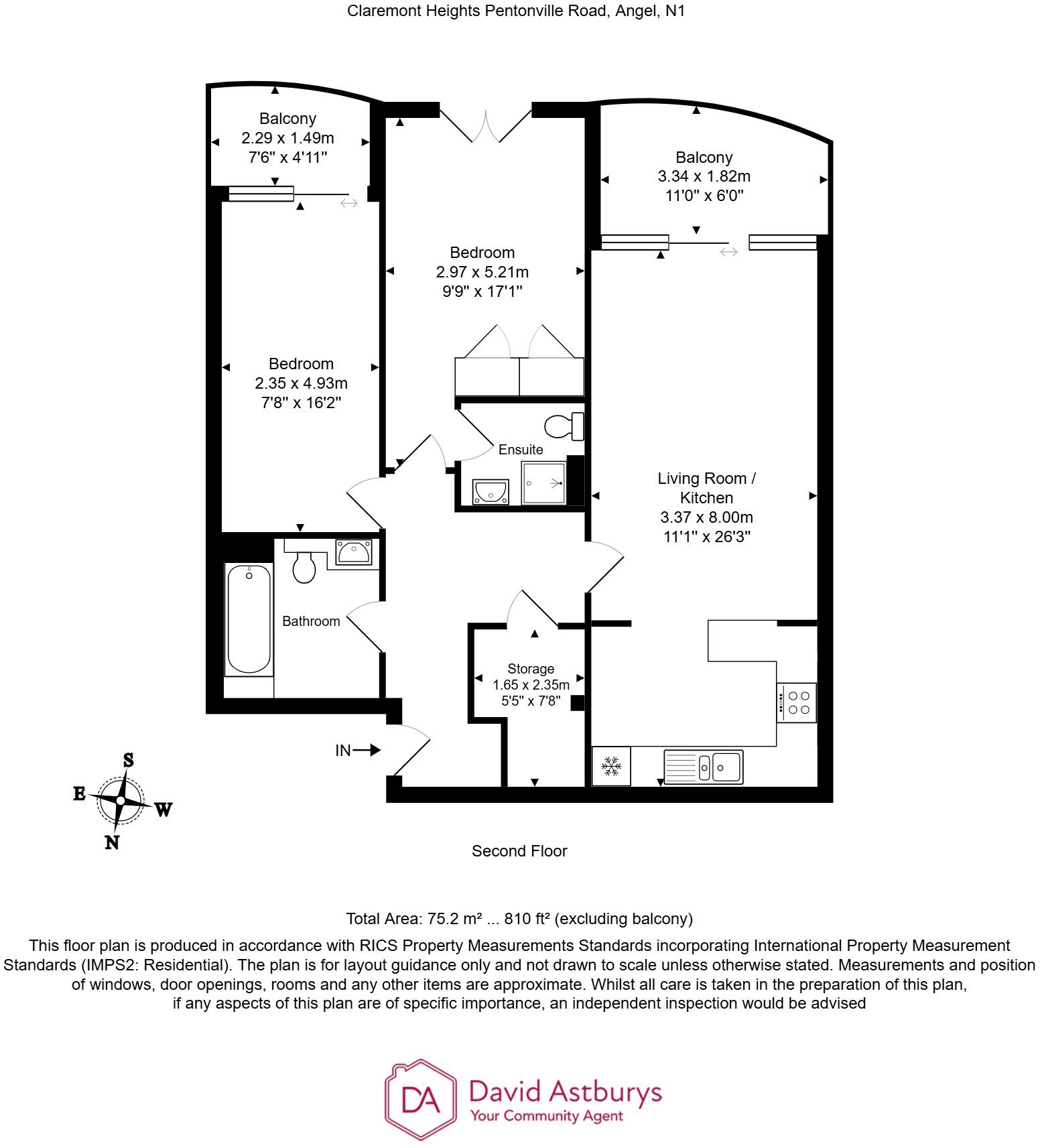 This is a two-bedroom apartment in Claremont Heights, Pentonville Road, Angel, London. The property is listed for £800,000 by David Astburys. It features two bathrooms and has a square footage of 809.45. The apartment is situated in a prime location in Islington, close to schools and transportation links. The property appears to be in good condition, with modern fixtures and fittings. While the apartment benefits from a balcony, it doesn’t have a garden. The price seems reasonable given the location, condition, and size of the property, aligning with the average price per square foot in the area.