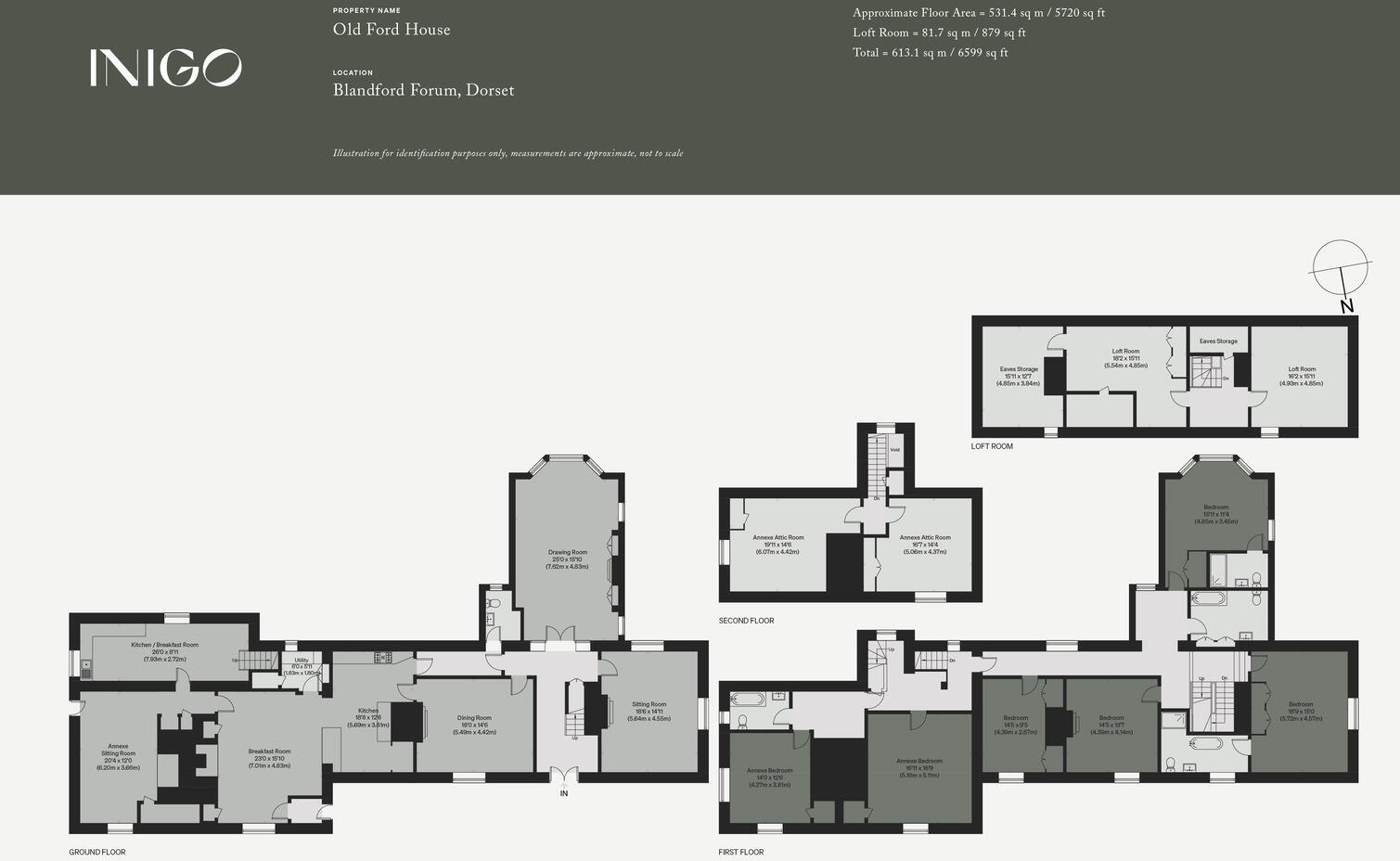 This elegant Grade II-listed eight-bedroom house sits in Blandford St Mary, just across the River Stour from the pretty market town of Blandford Forum, amid the rolling hills of Dorset. Spanning some 6,599 sq ft, it now extends over three storeys and includes a self-contained annexe. Approximatel...