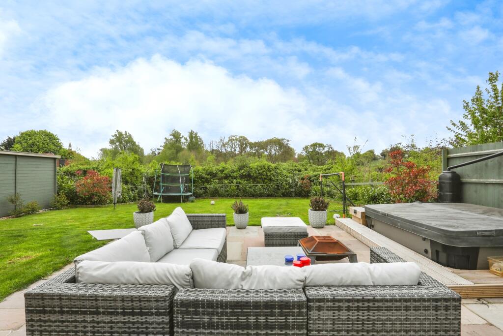 This property is a 5 bedroom detached house located in Goodlands, Sudbury, Suffolk. It is listed at £850,000 with 2,428.66 sqft of living space and a 2,653.30 sqft plot. The average price for a property in the area is £211,429 with an average price per sqft of £182. The property appears to be in excellent condition and has a large garden with a hot tub and shed. There is also a detached garage. The location is good, with a primary school nearby. The price seems high compared to other properties in the area, but the size and condition of this property justify the higher price.