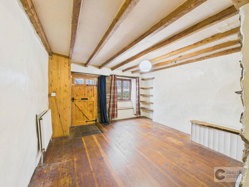 This is a two-bedroom cottage located on Bridge Street in Ipplepen, Devon. The property is listed for £185,000. It is a period property that requires some renovation. The cottage is located close to local amenities, including Ipplepen Primary School. Newton Abbot and Totnes train stations are also within a reasonable distance. The property has a small roof terrace but no garden. The interior features exposed stone and beams, adding character. The kitchen and bathroom are dated and would benefit from modernisation.