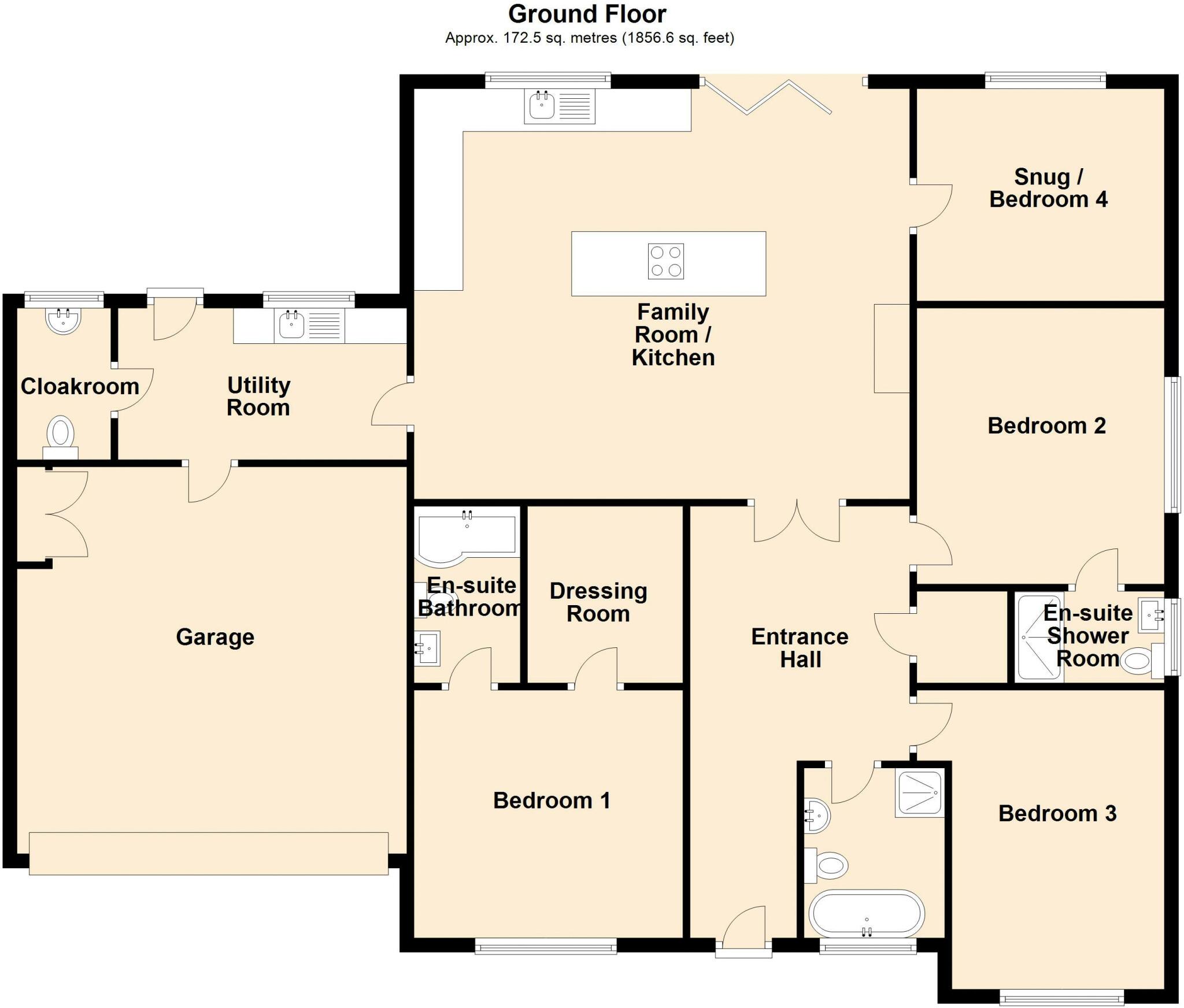 A newly constructed individual detached bungalow providing exceptionally well appointed and proportioned accommodation of over 1700 square feet with three double bedrooms / three bathrooms, snug or fourth bedroom and a superb 24' x 20' family room / kitchen, south facing over fields on a ...