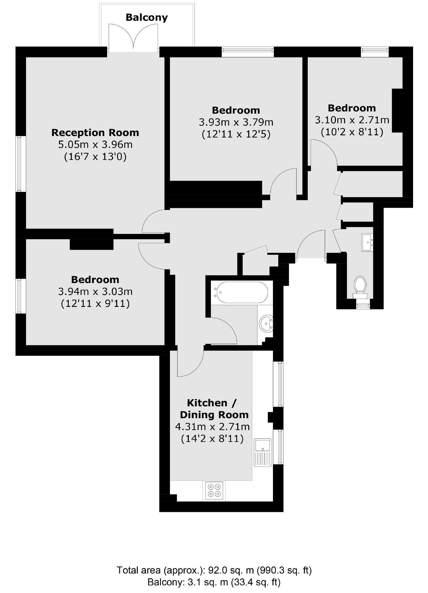 A three bedroom flat with a spacious reception room that has access to a private balcony, three good size double bedrooms, a bathroom and a separate W.C. There is also an eat-in kitchen with great storage space throughout.