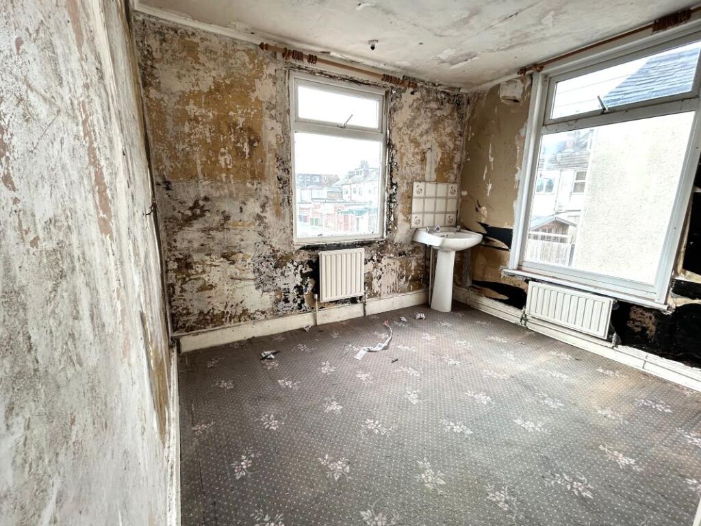 This is a terraced property located on Albion Road in Great Yarmouth. The property requires extensive renovation, as evidenced by the images showing damaged walls, flooring, and fixtures. Some windows are boarded up. The property is listed for £60,000, which is significantly below the average price for the area. This presents an opportunity for investors or buyers willing to undertake a comprehensive renovation project. The location is reasonably convenient, with nearby schools and transportation links. However, the limited outdoor space is a drawback. Overall, the property’s value lies in its potential after renovation, given its low price point.